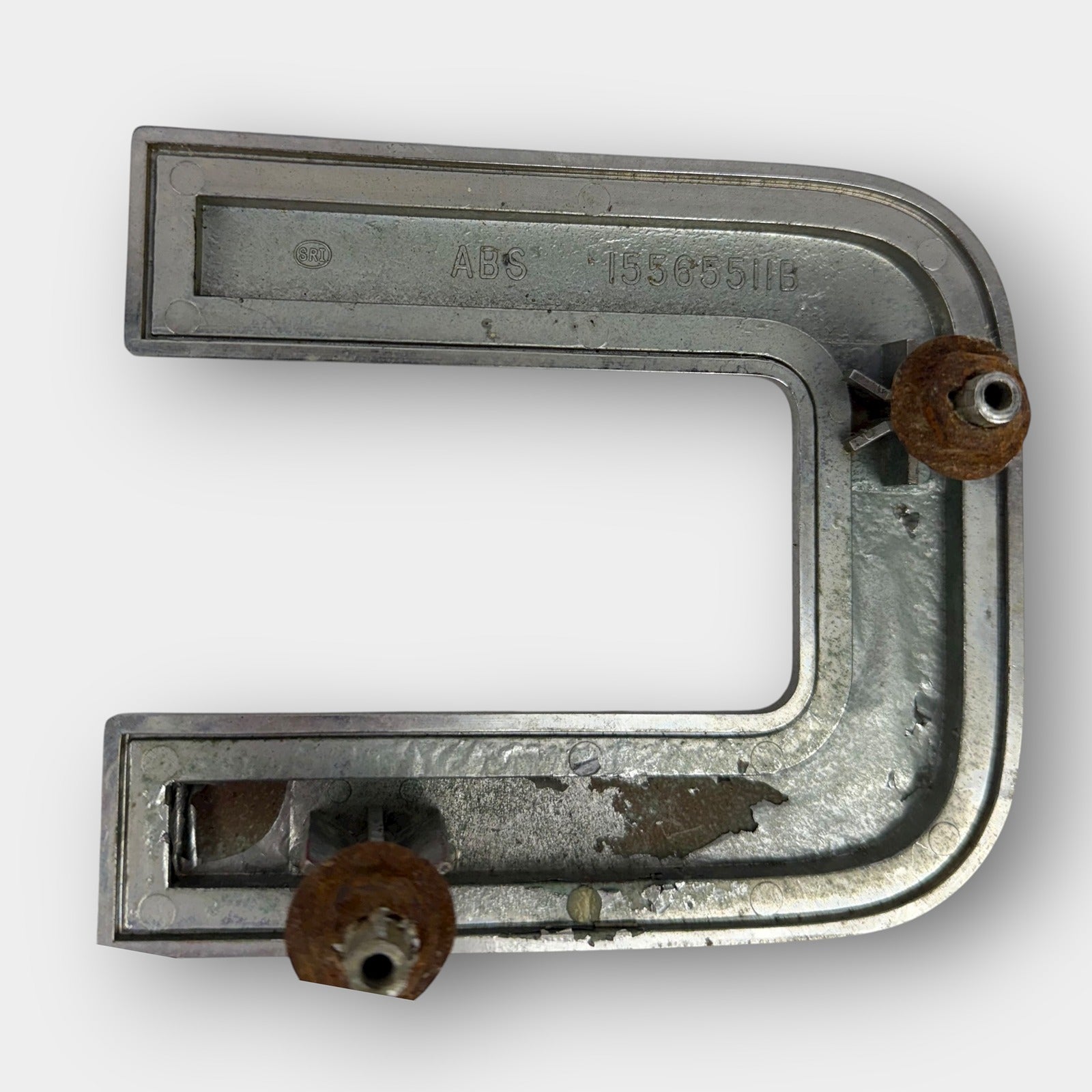 This is a red GMC grille emblem / badge in chrome accent trim, originally from a GMC vehicle. The front face is red with a raised chrome border; mounting studs and hardware remain on the back. There are minor surface scratches, paint wear, and light oxidation around edges. It fits GMC grille applications (check mounting distance). No cracks or breaks observed