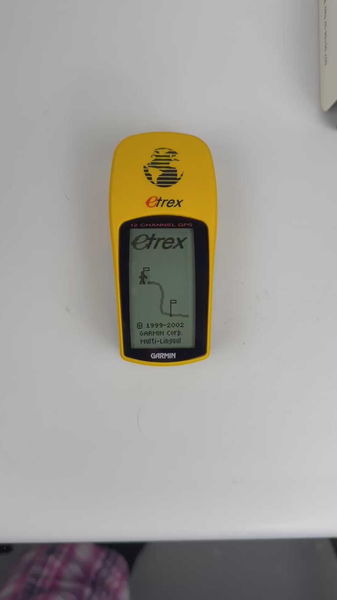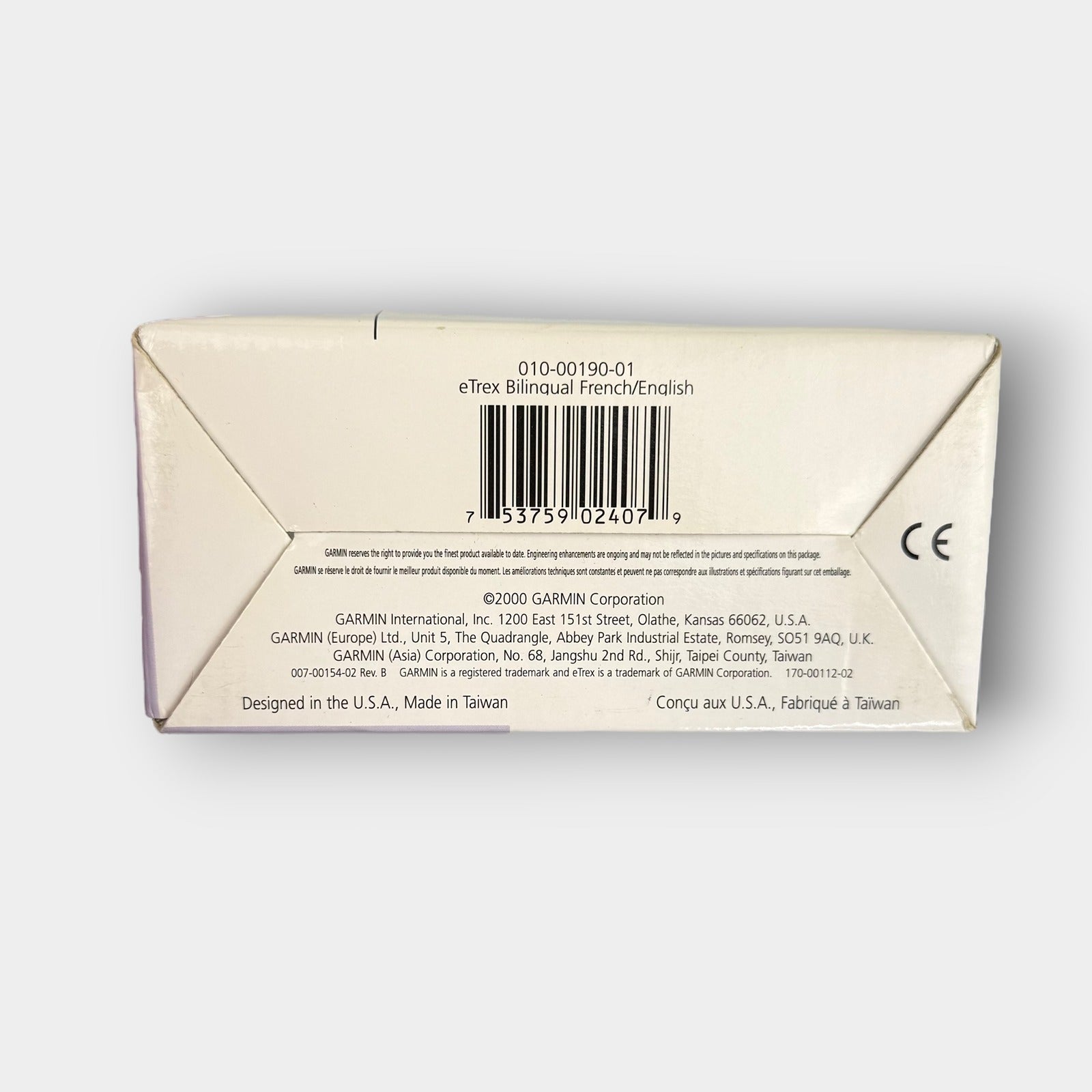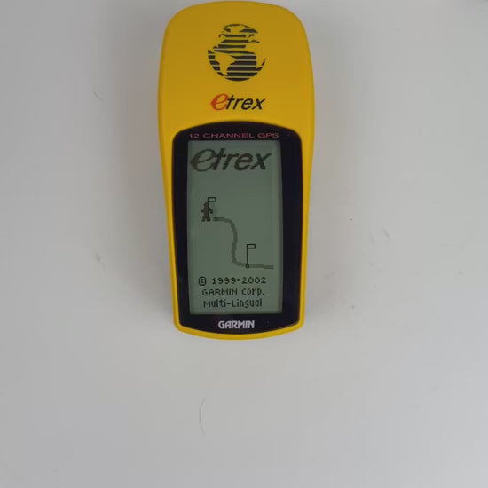 Garmin eTrex 12-channel handheld GPS in yellow, includes original box, manual, and protective rubber grip (which has detached — a known issue for this model). Powers on and acquires satellites, backlight works, features include 500 waypoint storage, 10 track logs, waterproof casing, and screen contrast controls. The casing shows light wear and scratches; battery compartment is clean with no visible corrosion
