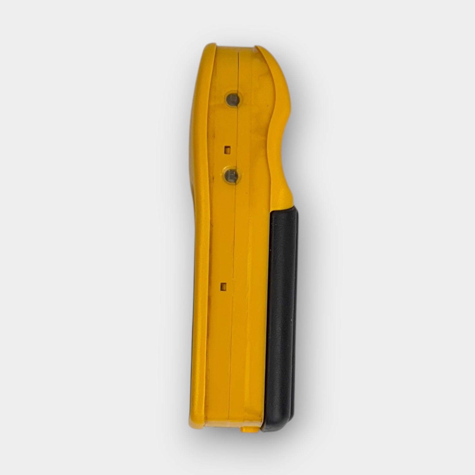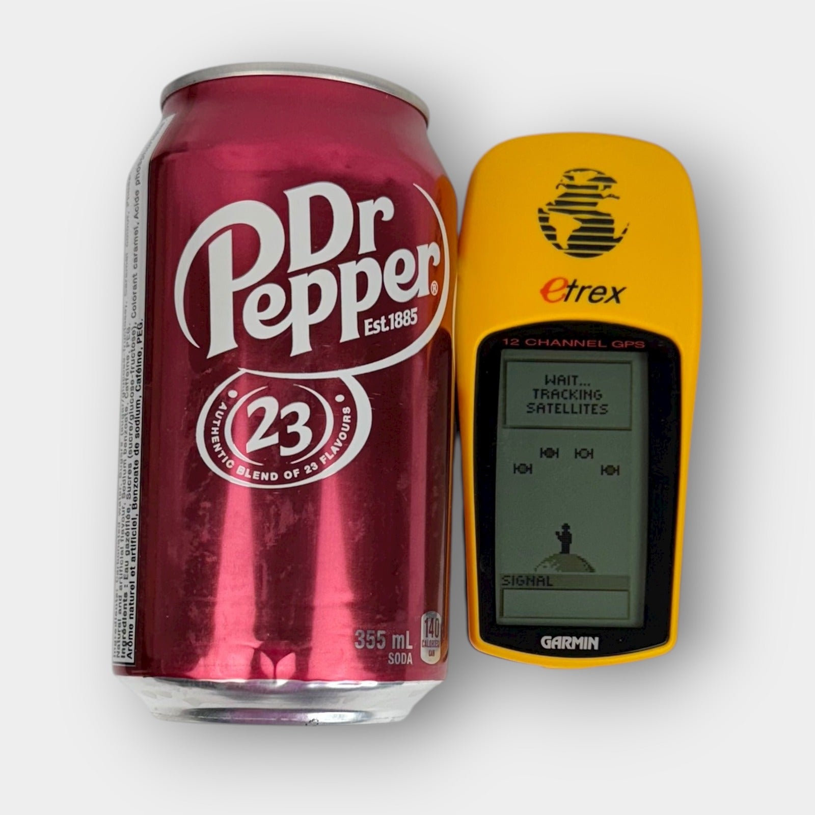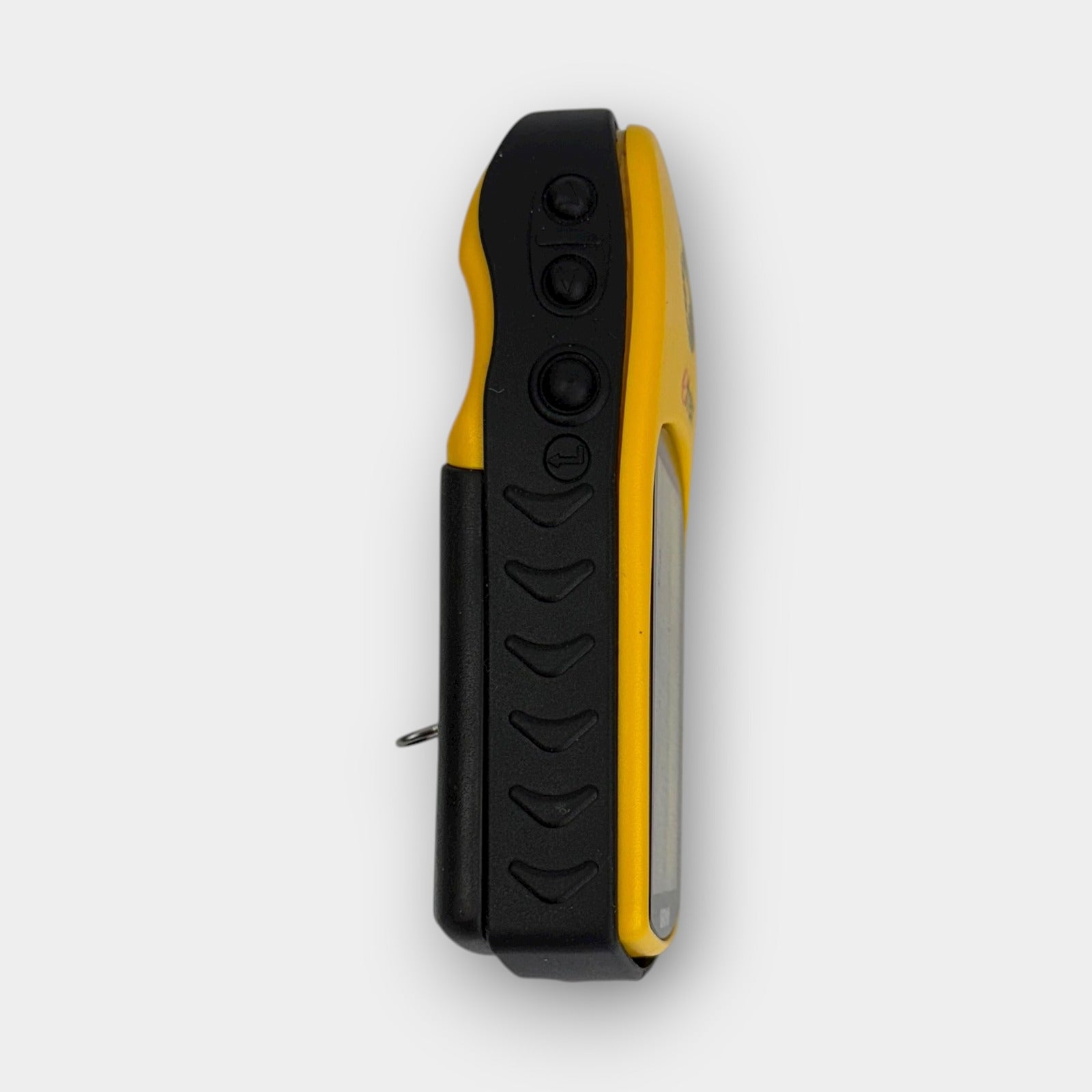 Garmin eTrex 12-channel handheld GPS in yellow, includes original box, manual, and protective rubber grip (which has detached — a known issue for this model). Powers on and acquires satellites, backlight works, features include 500 waypoint storage, 10 track logs, waterproof casing, and screen contrast controls. The casing shows light wear and scratches; battery compartment is clean with no visible corrosion