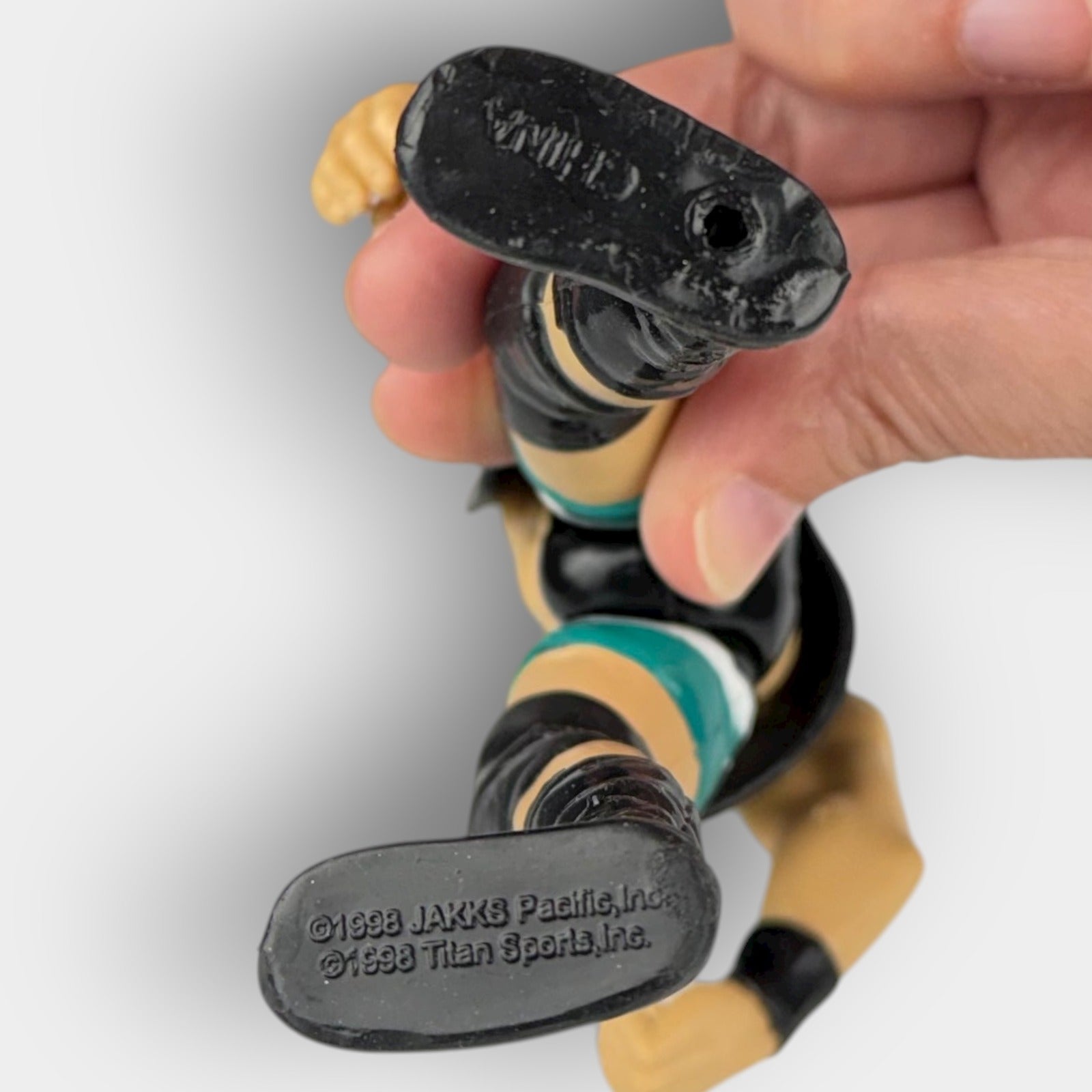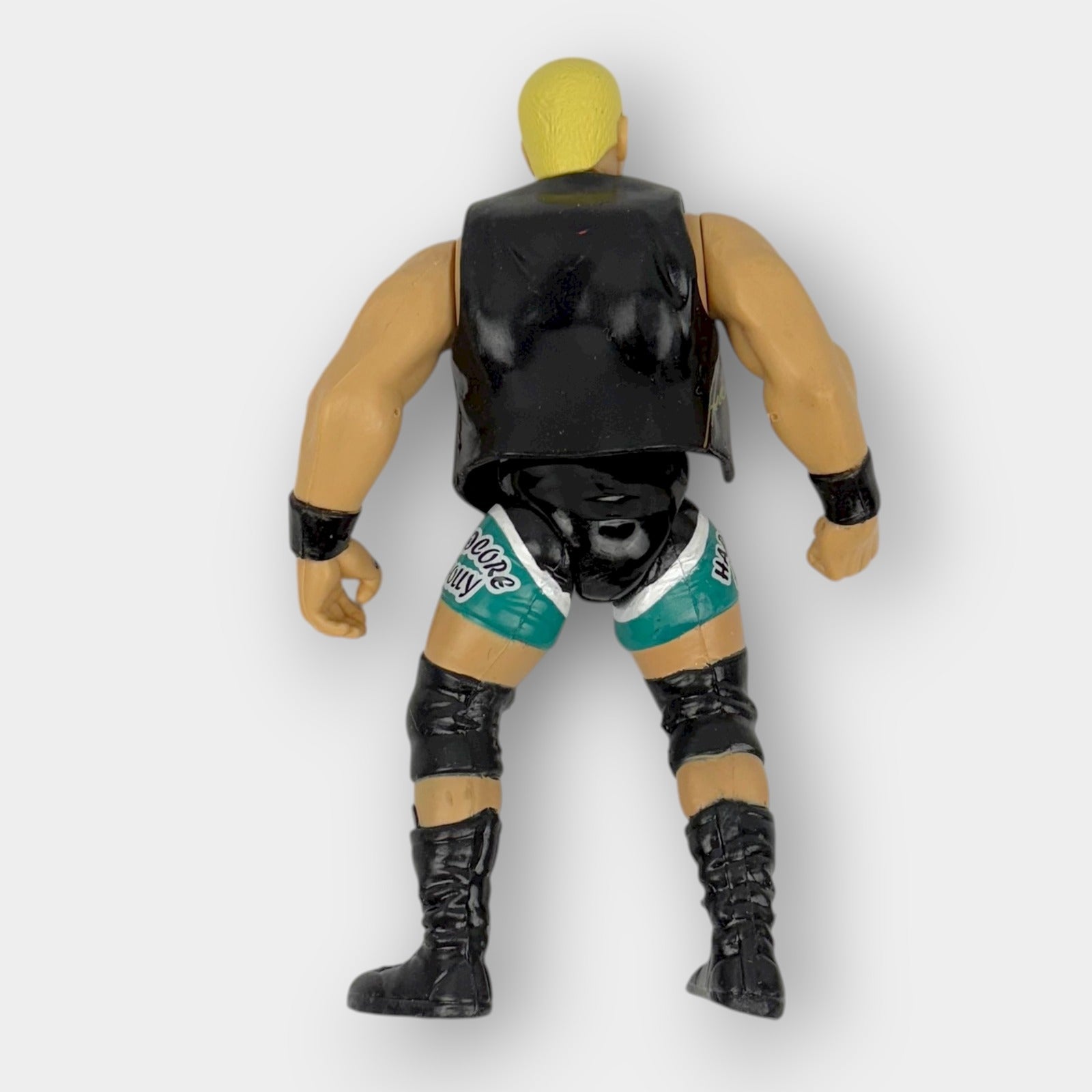 Original 1998 Jakks Pacific WWF Hardcore Holly action figure, featuring black vest and teal/black trunks with "Hardcore Holly" text. Approximately 6 inches tall with articulation at hips, waist, and shoulders. Figure is in good condition with light play wear consistent with age