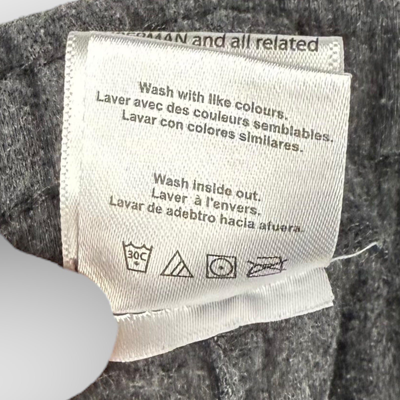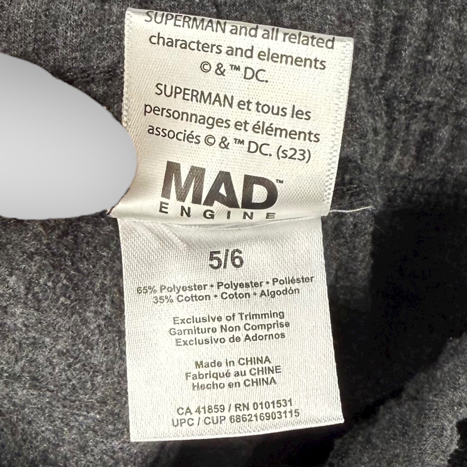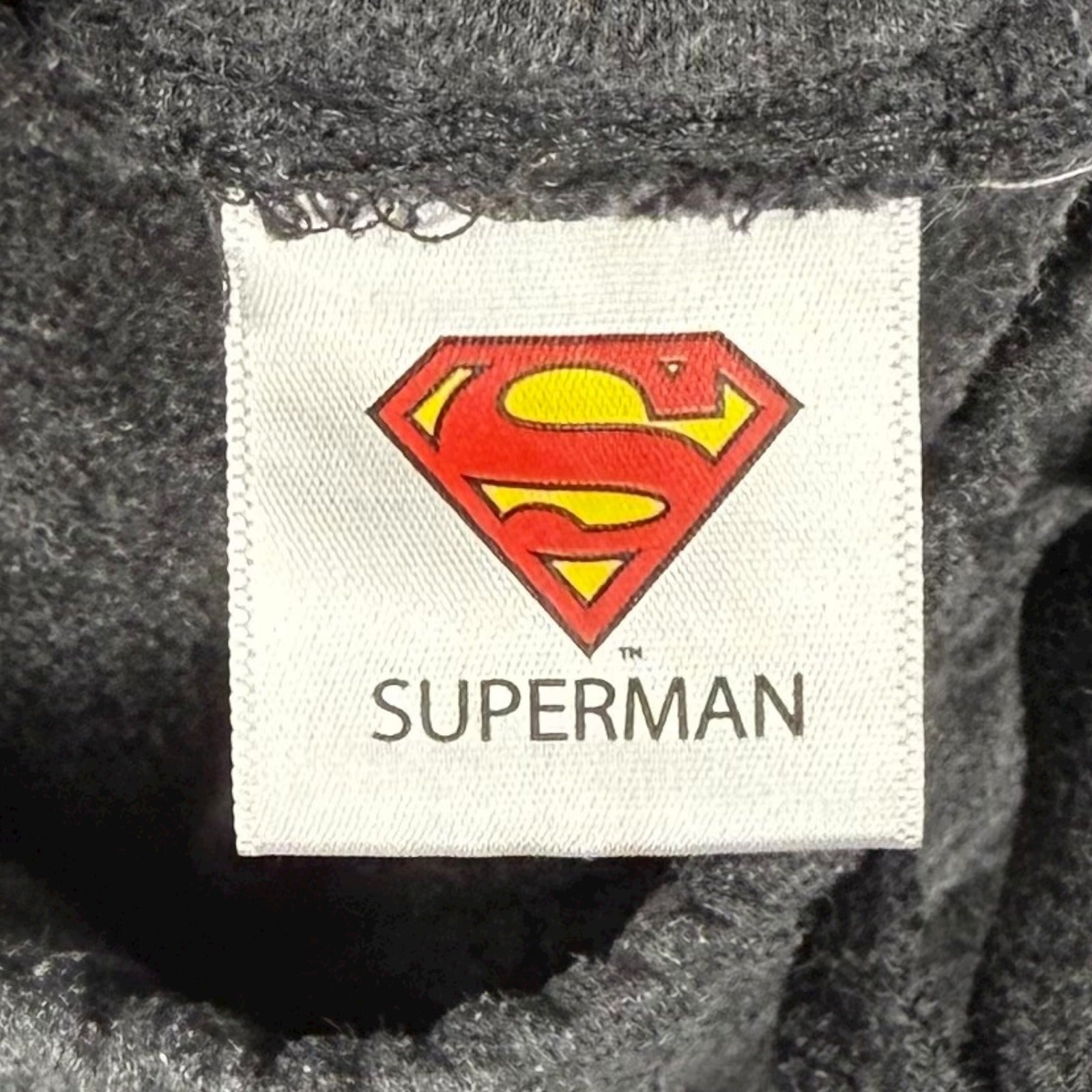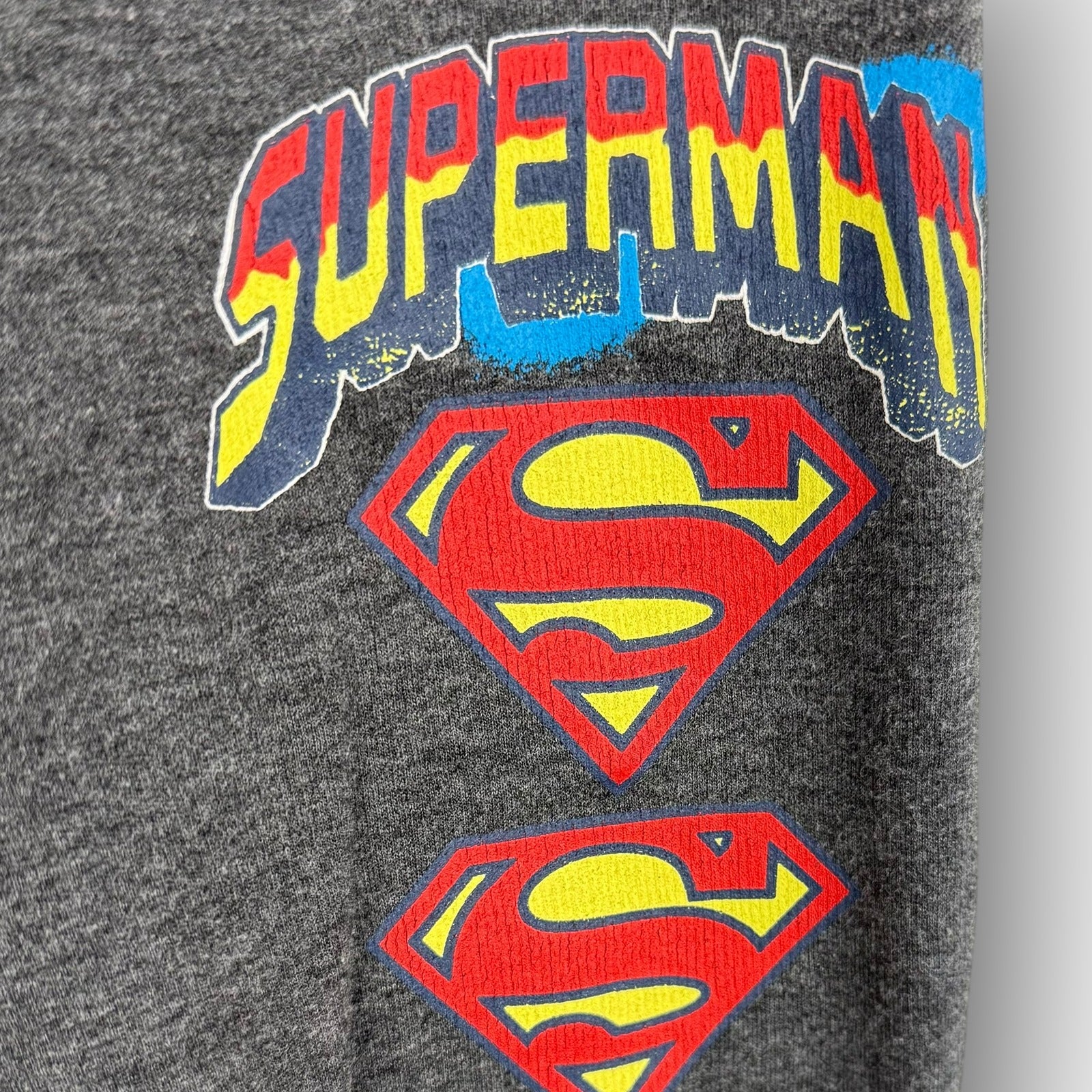 Superman jogger pants with fleece lining, elastic waistband, and bold logo prints along the leg. Light cracking of the design