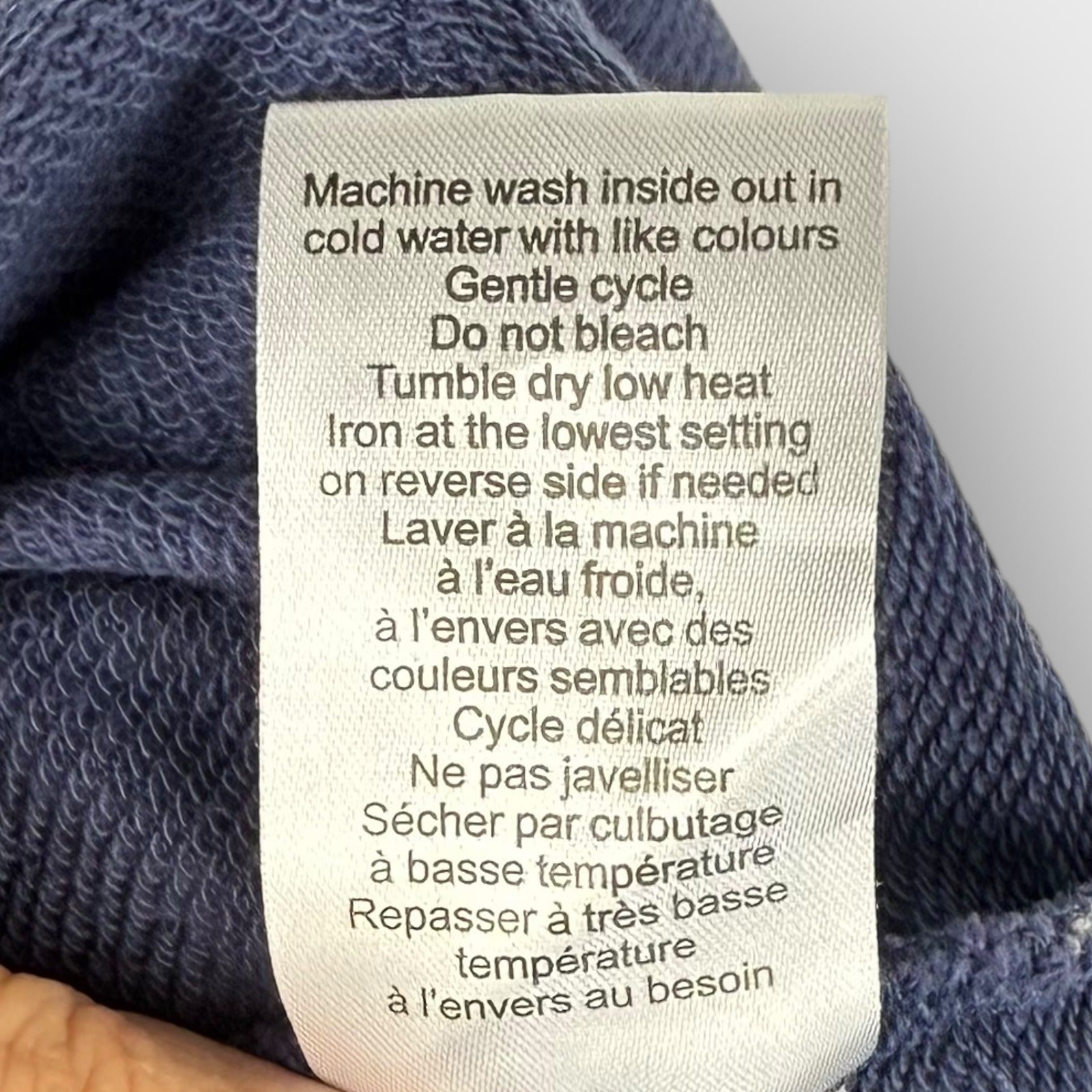 Navy blue hoodie with pullover hood, front kangaroo pocket, and ribbed cuffs and hem