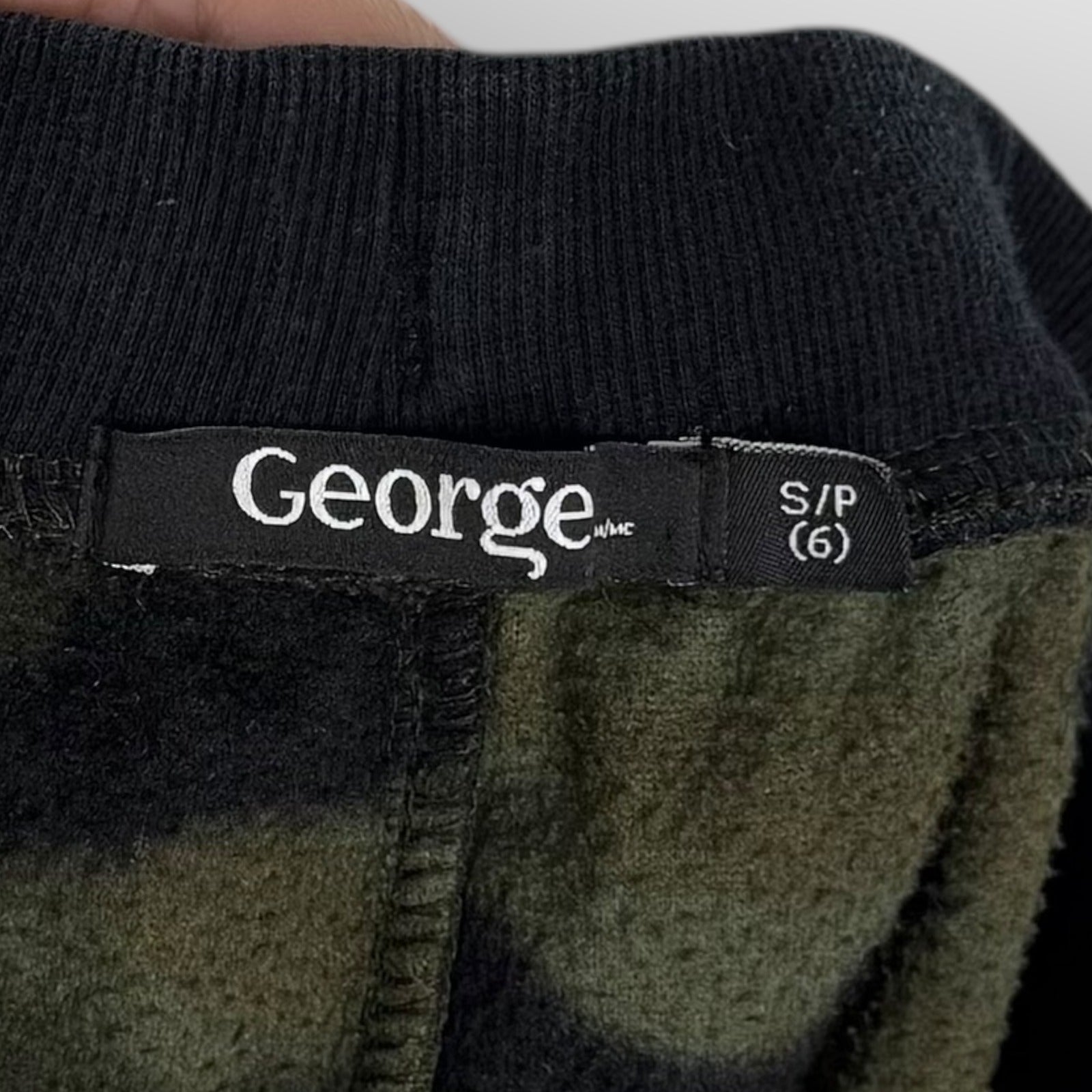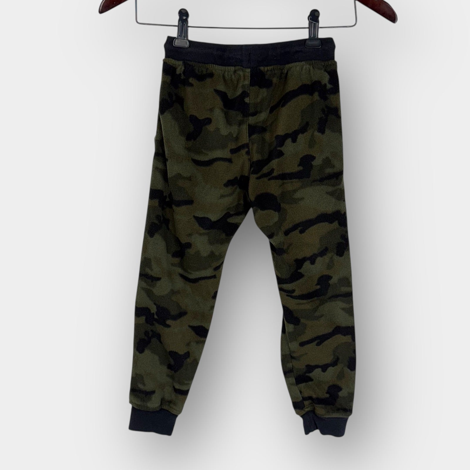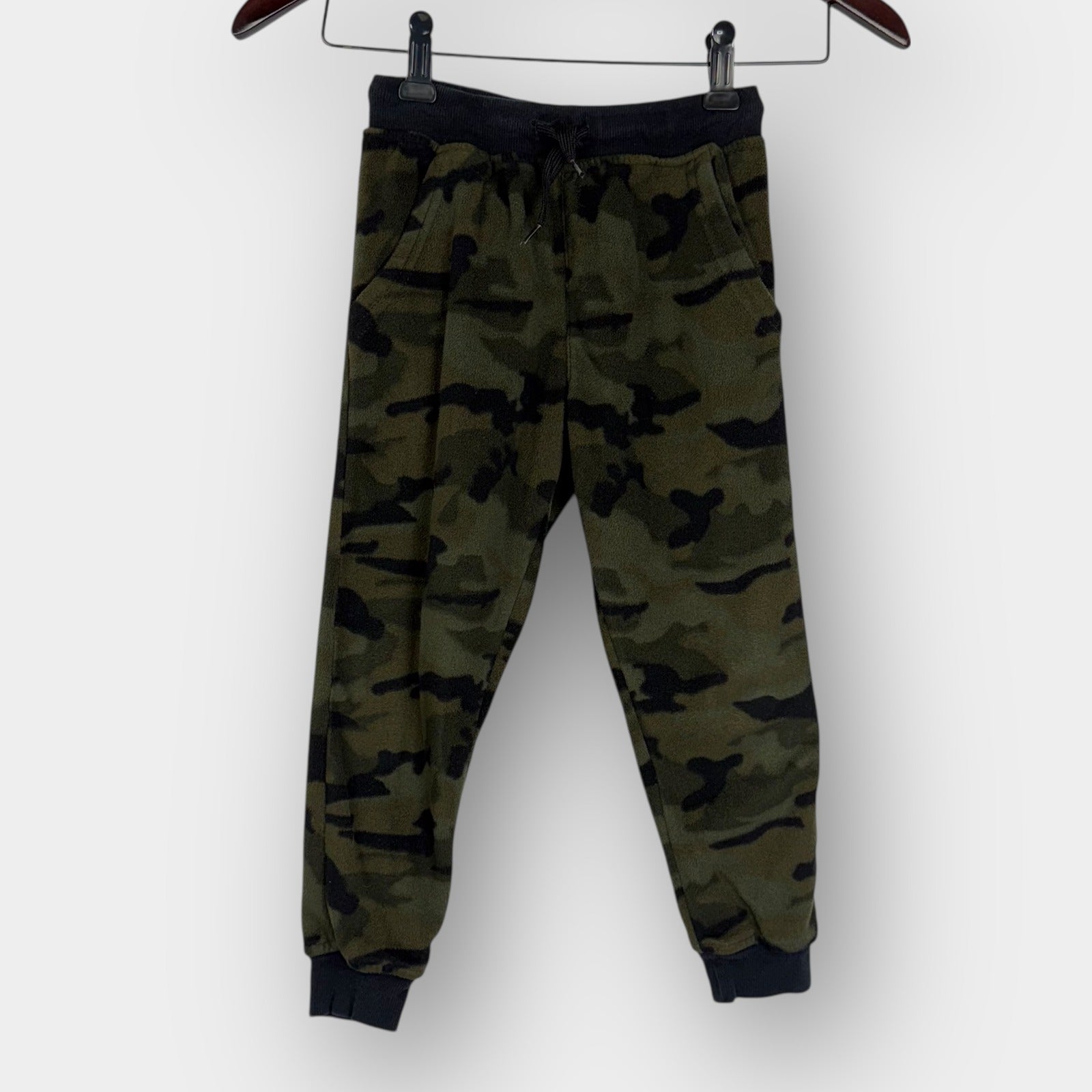 Soft camo-print fleece jogger pants featuring a drawstring elastic waistband, ribbed ankle cuffs, and side pockets
