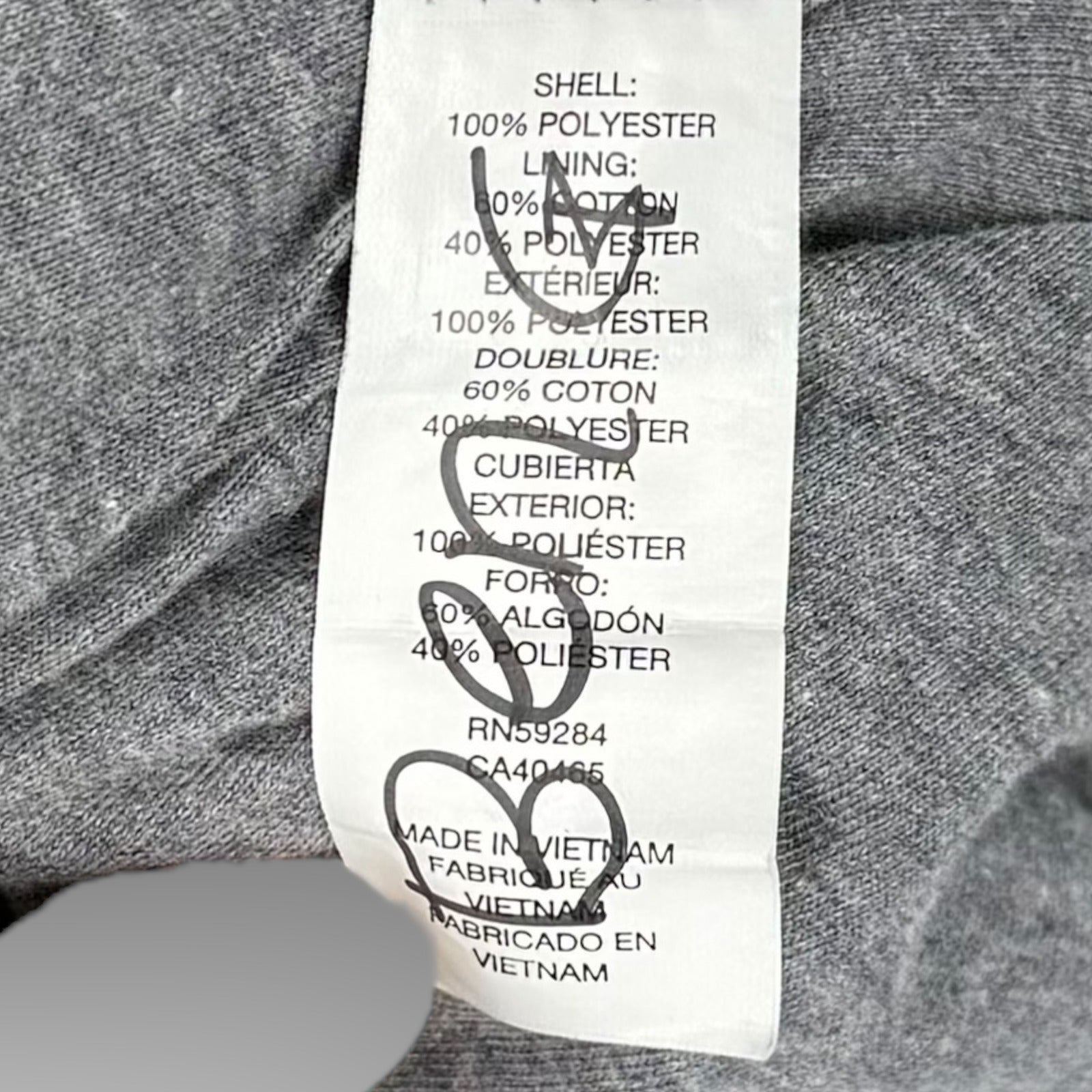 Gray athletic track pants featuring a straight-leg silhouette with an elastic waistband and interior drawstring. Reflective stripe logo detail at the hip and along the side seams