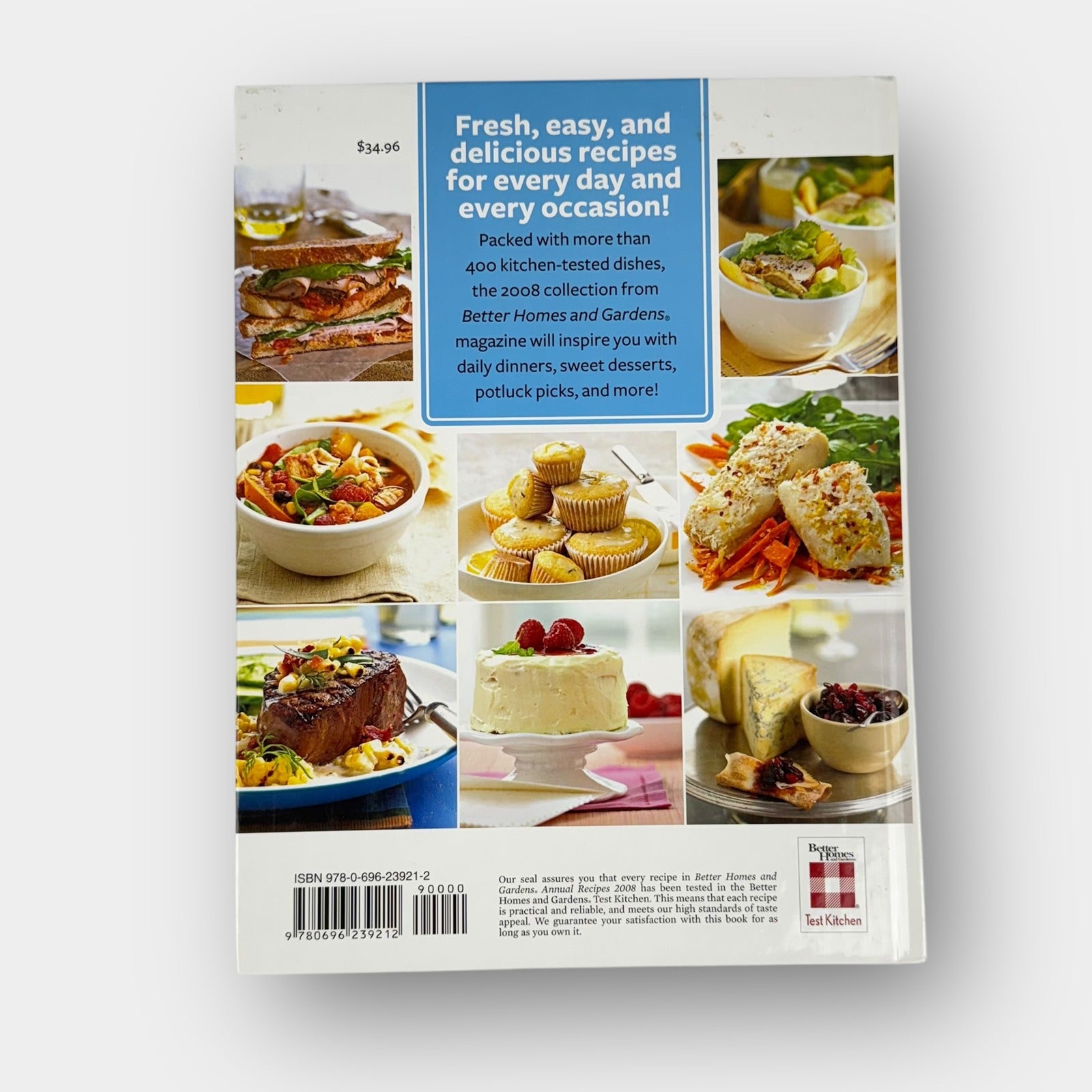 A beautifully photographed hardcover edition of Better Homes & Gardens Annual Recipes 2008, filled with tested, easy-to-follow recipes for everyday meals and special occasions. Includes step-by-step instructions, full-color images, and indexed sections for appetizers, mains, and desserts—perfect for home cooks or collectors of the BHG annual cookbook series