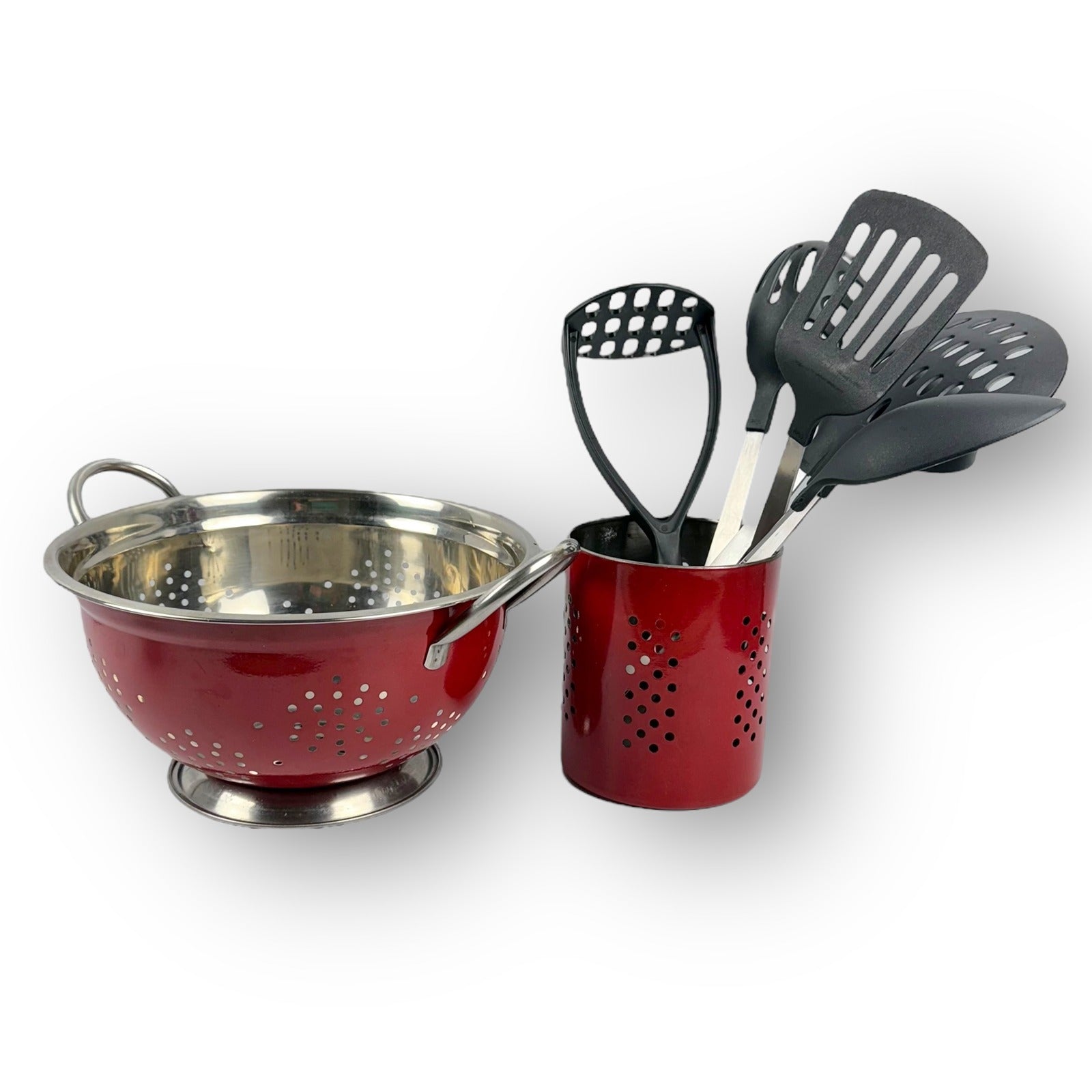 Matching red kitchen lot including an enamel colander with stainless rim, base ring and twin loop handles, plus a red perforated utensil crock holding six everyday tools (masher, pasta server, ladle, slotted turner, solid spoon and slotted spoon)
