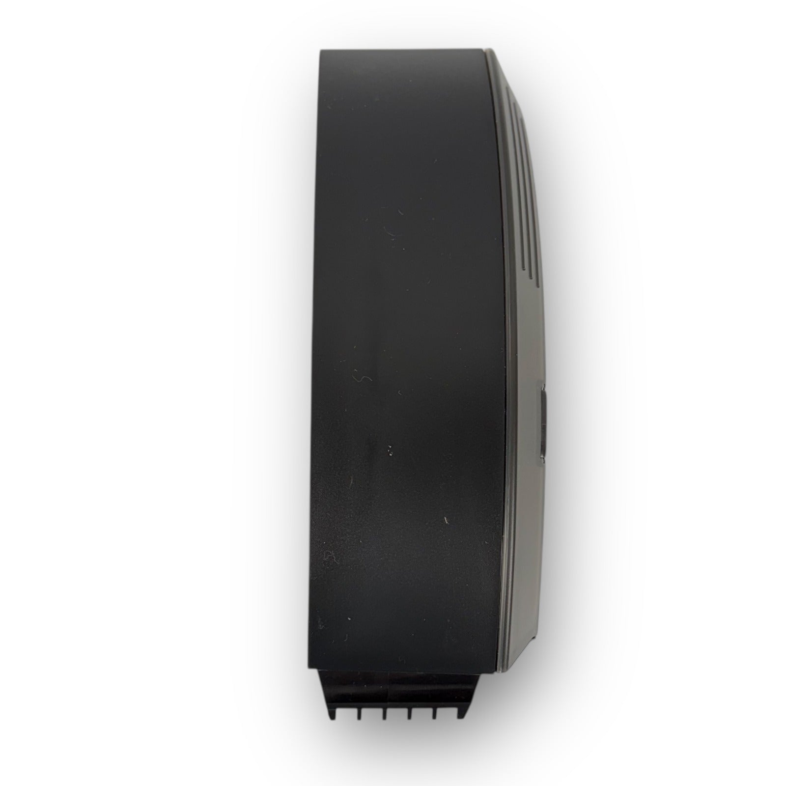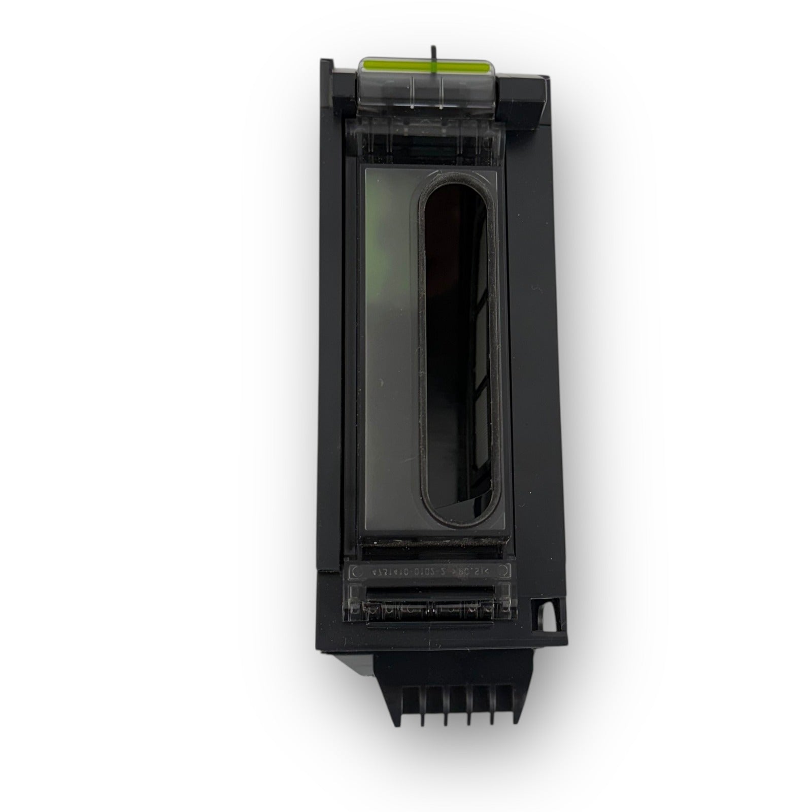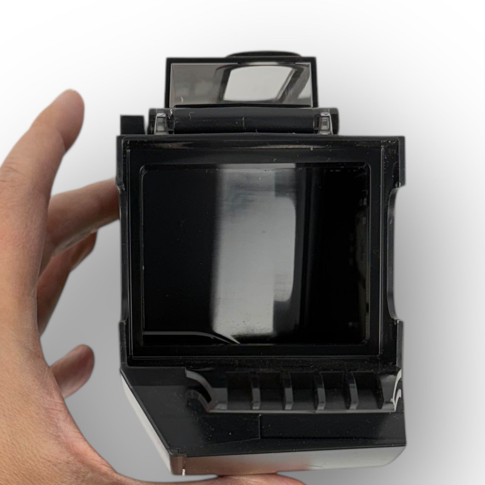 Black dust bin with green evacuation port for Roomba models that use the Clean Base; clear top lid with hinge, front latch, and internal mesh screen. Housing and lid close securely. Shows the correct side geometry and port style for self-emptying i/j series robots; not for non-self-emptying versions