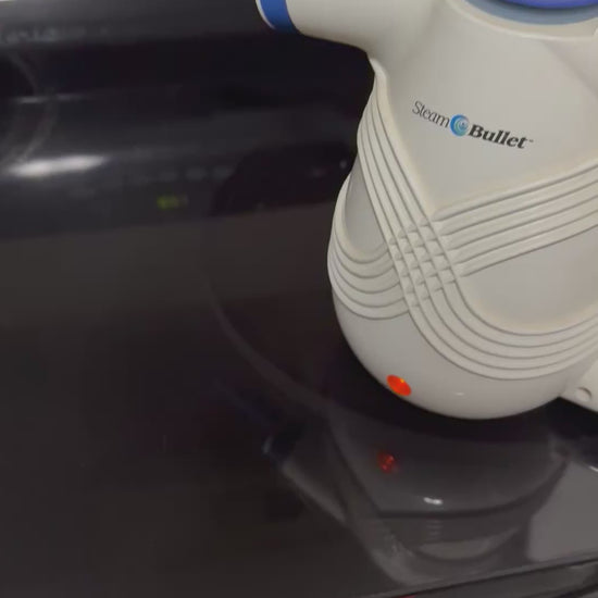 Compact corded handheld steam cleaner with white body and blue accents, featuring a twist-lock safety cap, trigger grip, indicator light, and fixed jet nozzle. Includes two screw-on extension nozzles plus the original operating instructions, all shown. Standard 3-prong North American plug with long cord. Housing and attachments show cosmetic scuffs, light soil, and age discoloration from normal use and storage