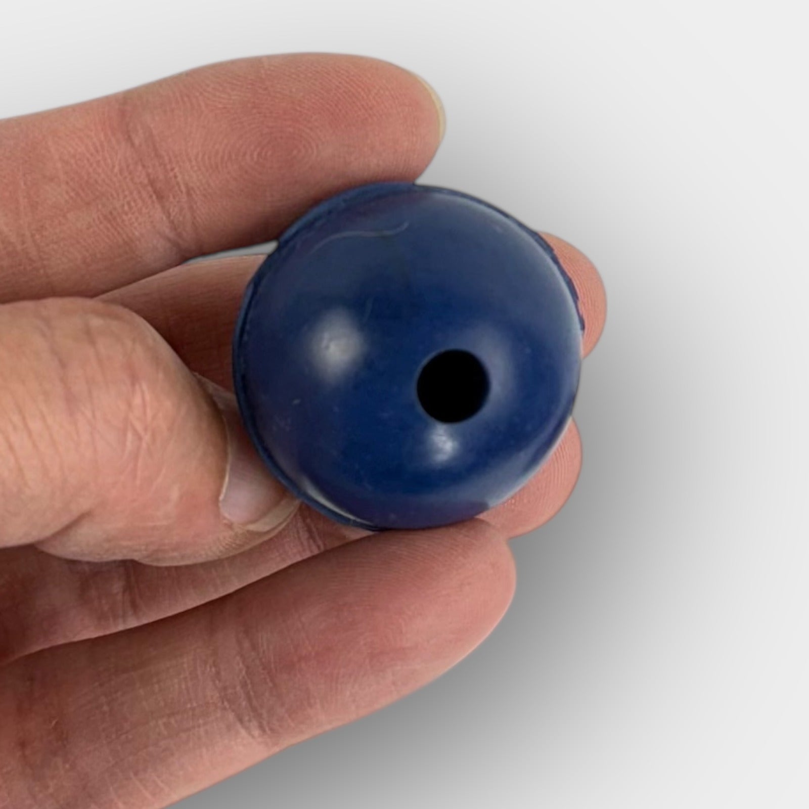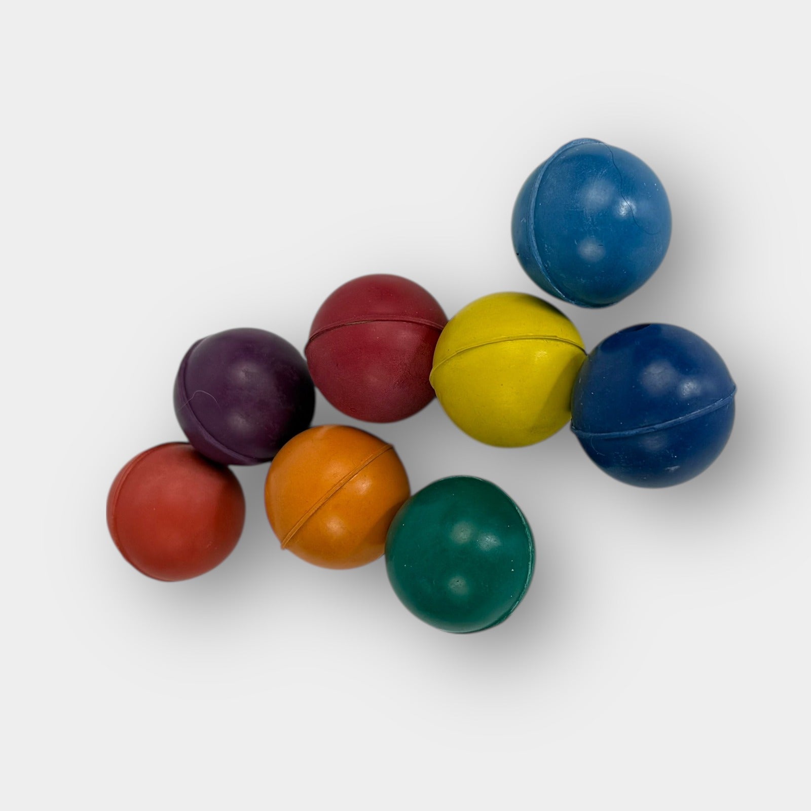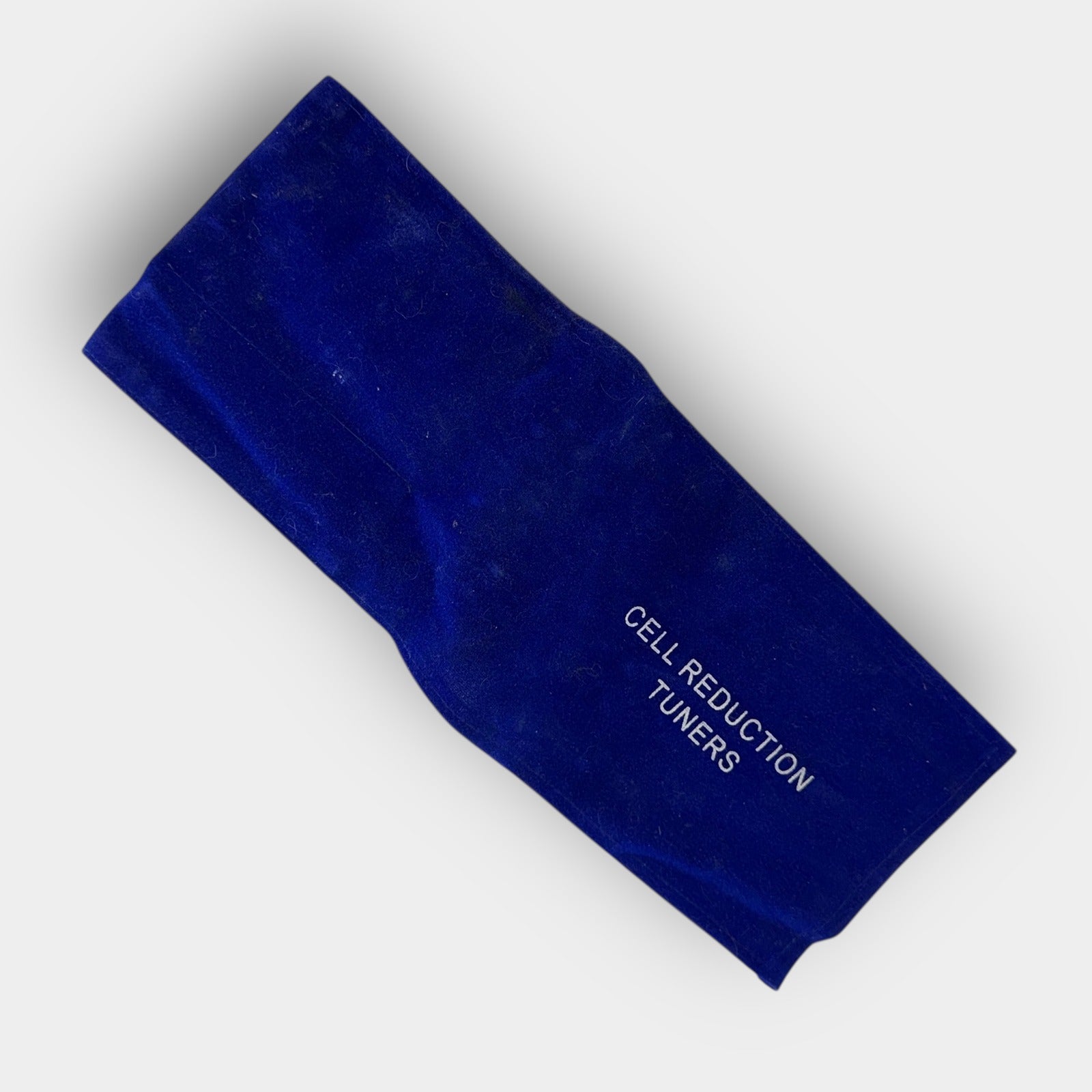 Compact weighted tuning-fork set labeled C# 295.8 Hz “Fat Cells” and E 324 Hz “Muscles,” each with knurled sliding weights and smooth chrome stems; includes wood-handle rubber mallet, soft blue two-pocket pouch, and nine hollow plastic node balls that fit over the fork stems. Light cosmetic scuffs on metal and edge wear on pouch from normal use; no cracks or bent tines; functions as intended