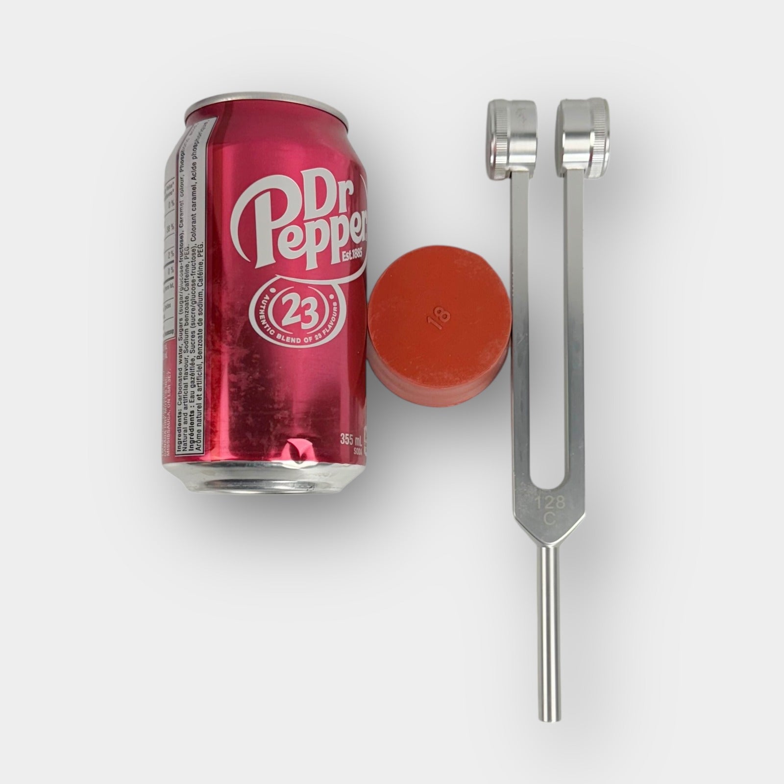 Precision weighted aluminum tuning fork tuned to C 128 Hz with knurled weights for sustained vibration; includes red rubber activator puck for consistent strikes and a long, smooth stem for comfortable hold. Clean, excellent used condition with light handling marks only; no dents, bends, or cracks