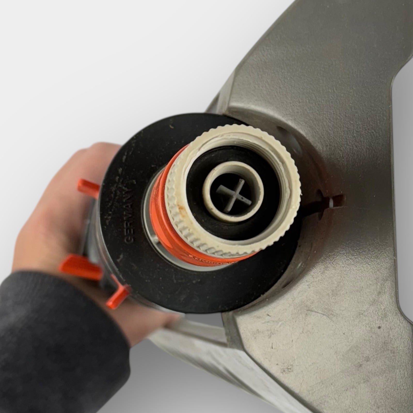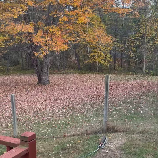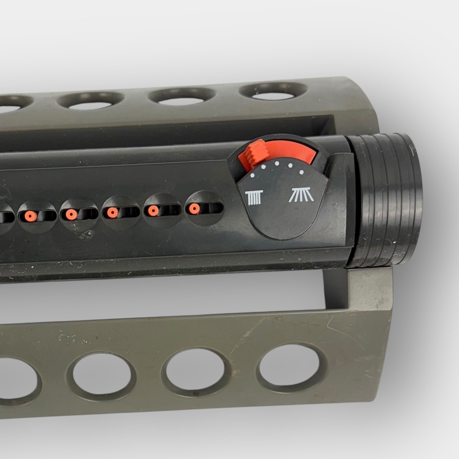 Gardena Aquazoom oscillating lawn sprinkler with adjustable range and width dials at both ends, multiple jet nozzles, flip-up flow shutoff, and end-cap cleanout. Standard Gardena quick-connect inlet installed. Tested and working; shows typical outdoor scuffs and dust consistent with normal use