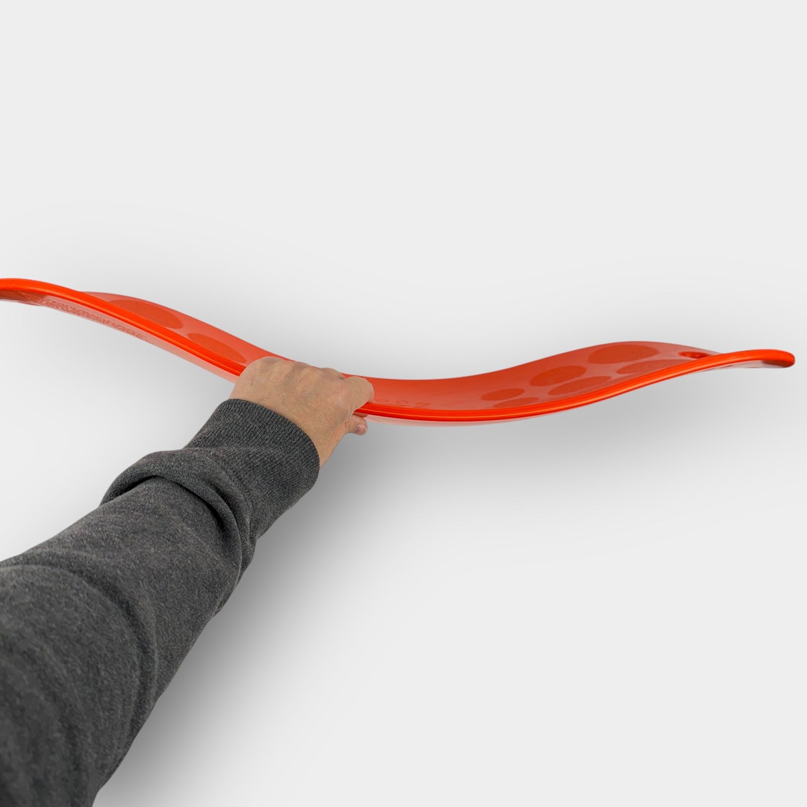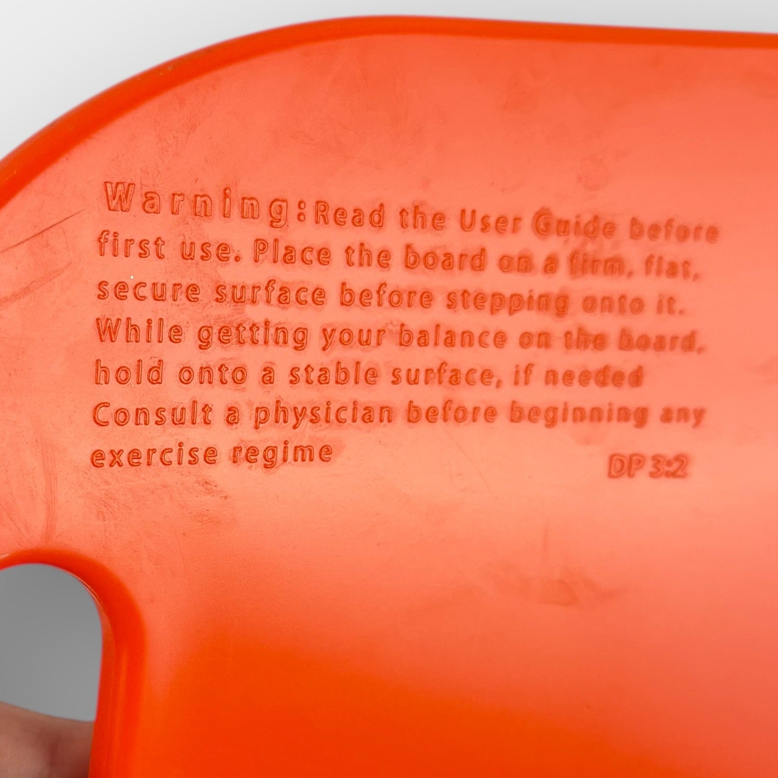 Bright orange Simply Fit balance board with dual carry/hand slots, textured anti-slip circle grips, and a curved rocker profile for twisting and core/balance exercises. Surface shows light scuffs from normal use; no cracks or warping noted