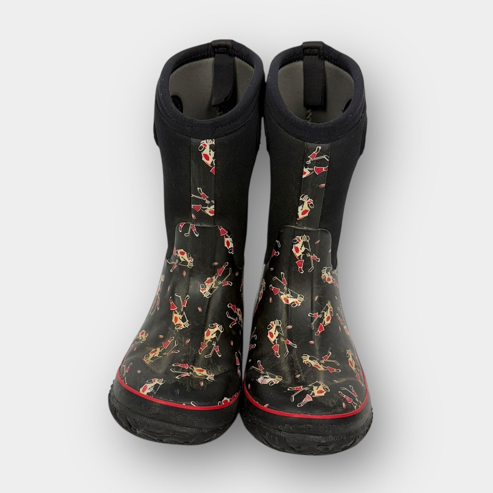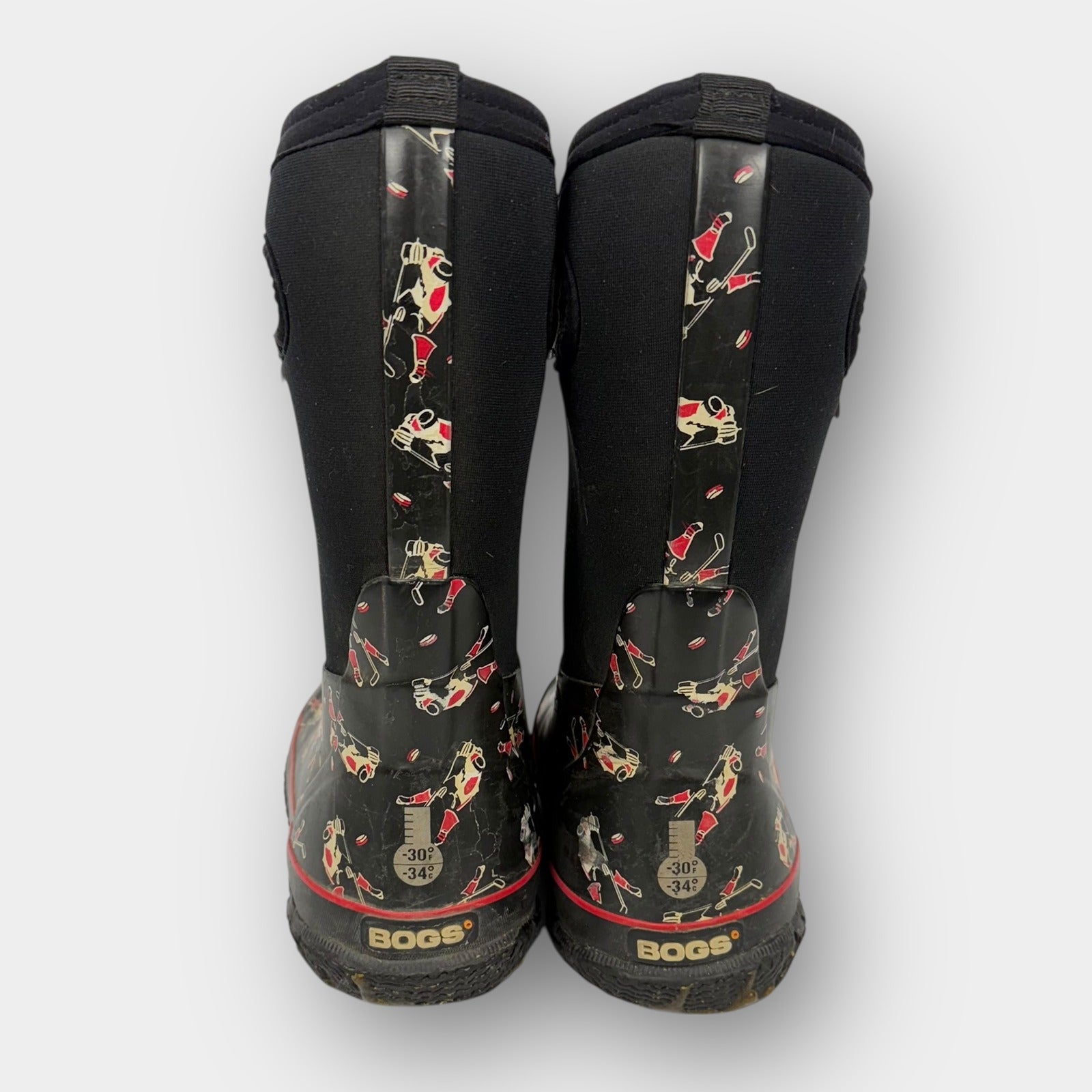 Black mid-calf BOGS kids boots with hockey-player print, red piping, pull-through handles, round toe, and rugged traction outsoles; rear graphics show the -30°F/-34°C icons. Donor applied a clear coating to the soles (see photos); last season they reported no leaks. Typical use wear to uppers and graphics; structurally solid