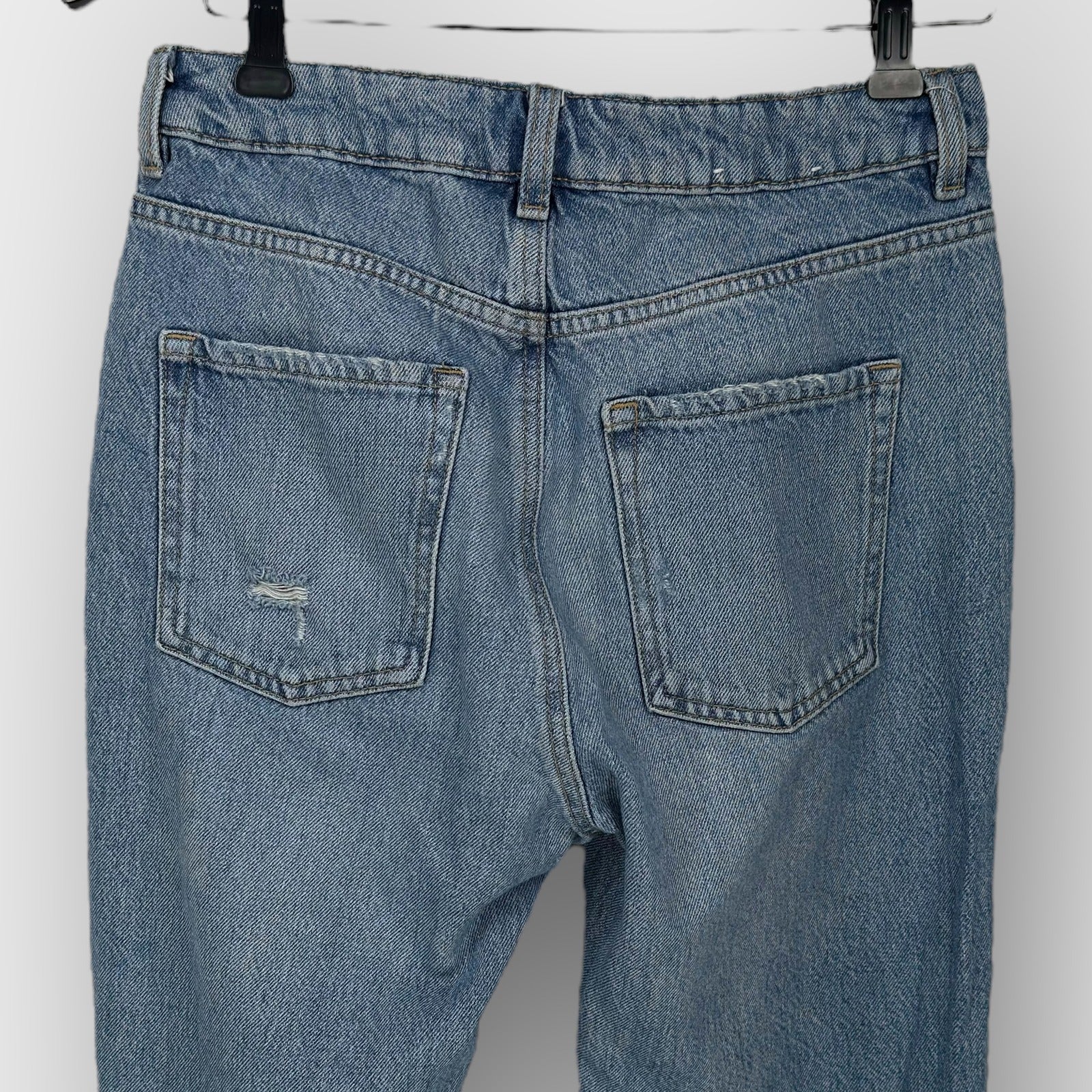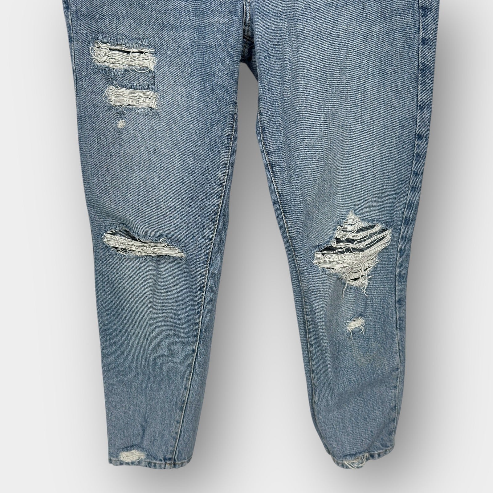 Light wash mom jeans with a tapered ankle and multiple abrasions and shredded knees. Classic five-pocket layout, zip fly with button, and belt loops. Subtle whiskering and light grind marks give a worn-in look throughout; ankle hems show light distressing consistent with the design