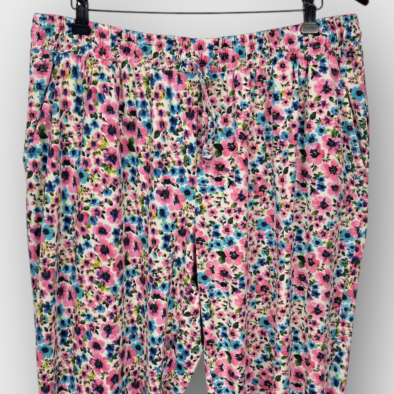 Soft jersey joggers with an elastic waistband and adjustable tie, side slip pockets, gathered cuffs, and an allover vivid micro-floral print on white. Measurements suggest an approximate women’s Large (12–14) fit, though there’s no size tag present