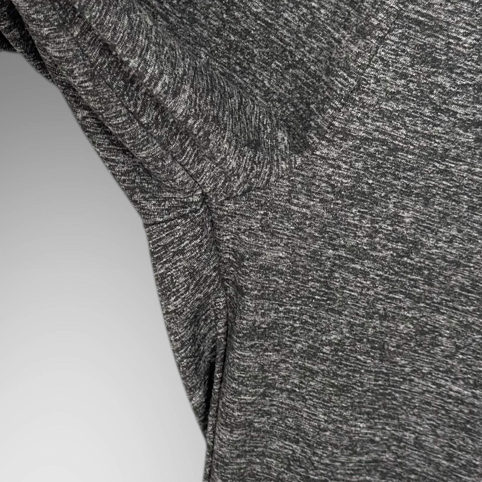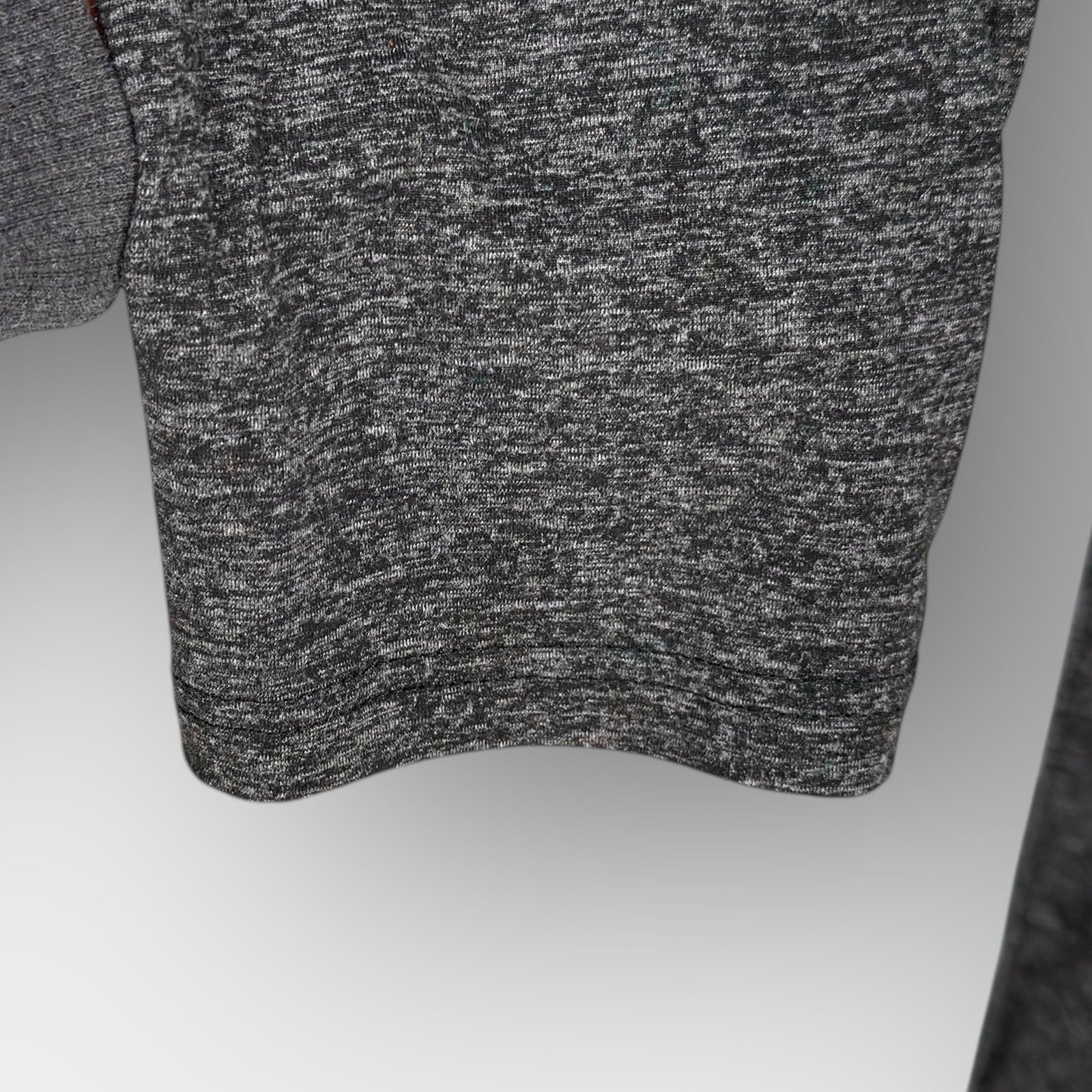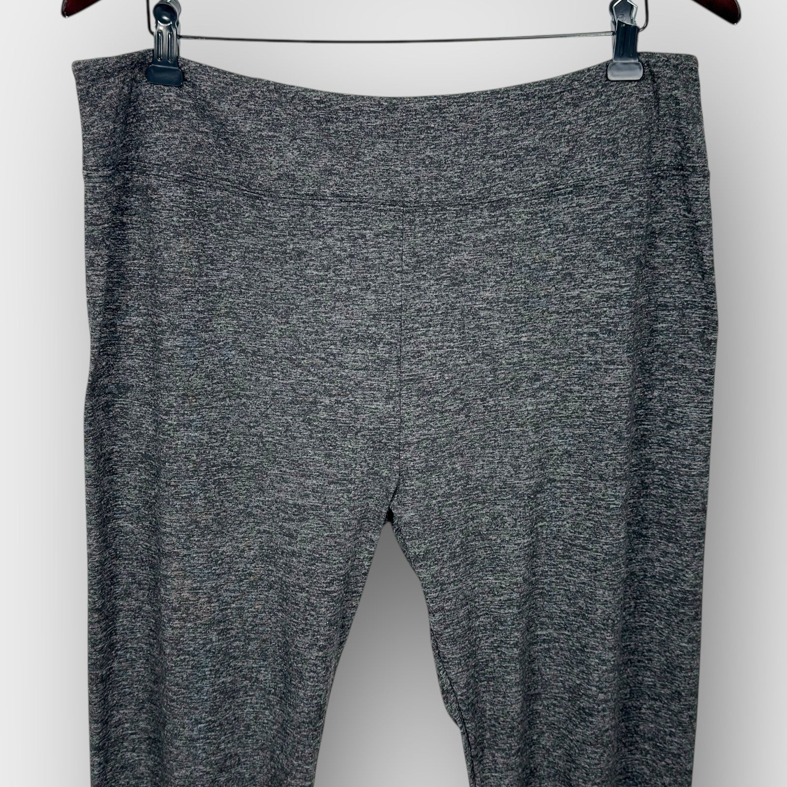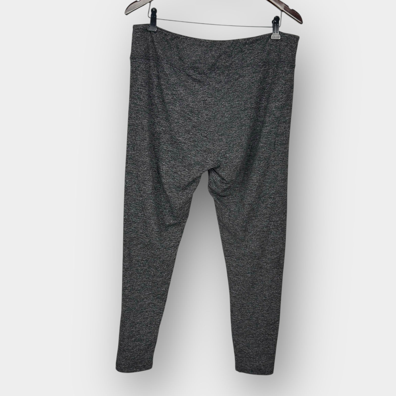 Heathered grey full-length leggings with pull-on elastic waistband. Smooth knit with stretch; unlined. Flatlock seaming at seat and inner leg; narrow twin-needle hems