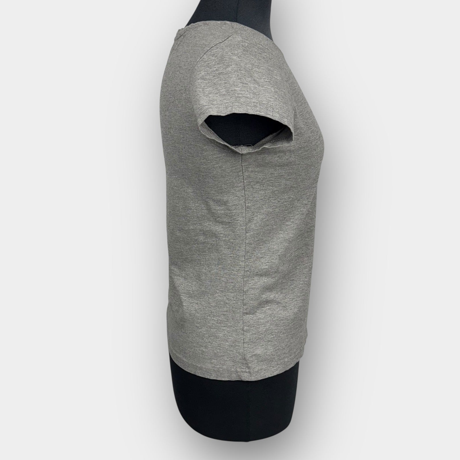 Classic short sleeve crewneck tee in heather grey with a fitted silhouette. Tag states Medium but fits closer to a Small based on provided measurements