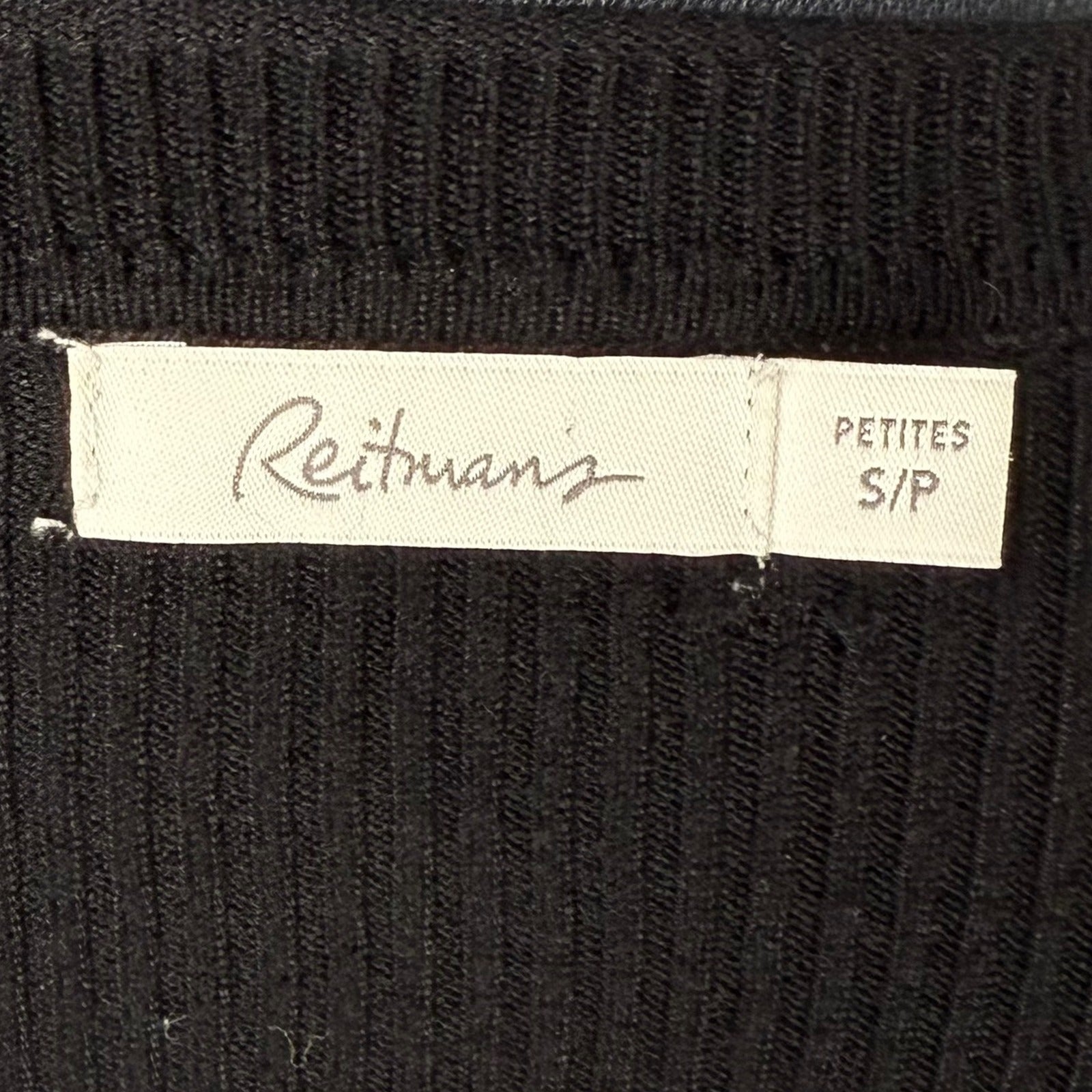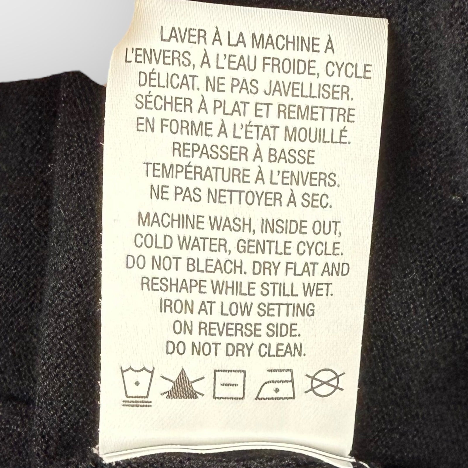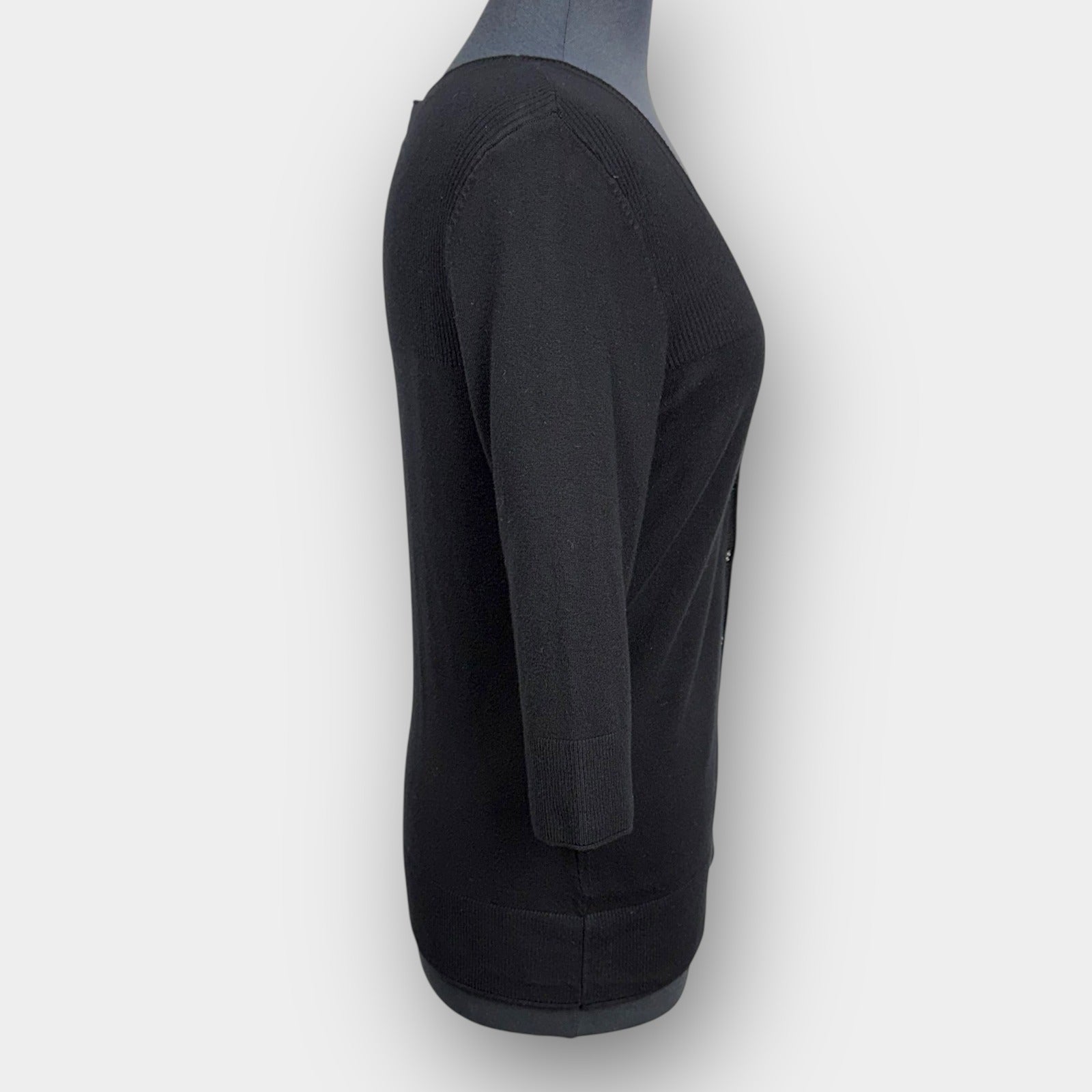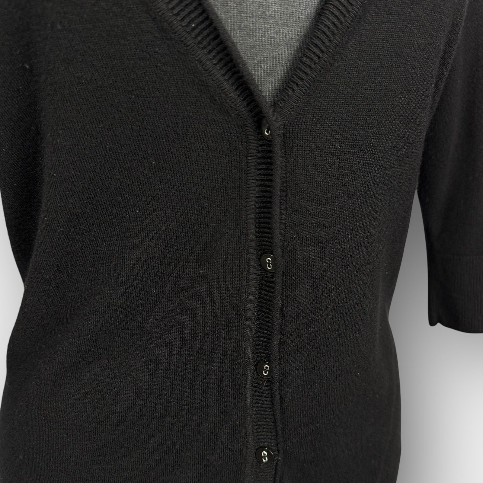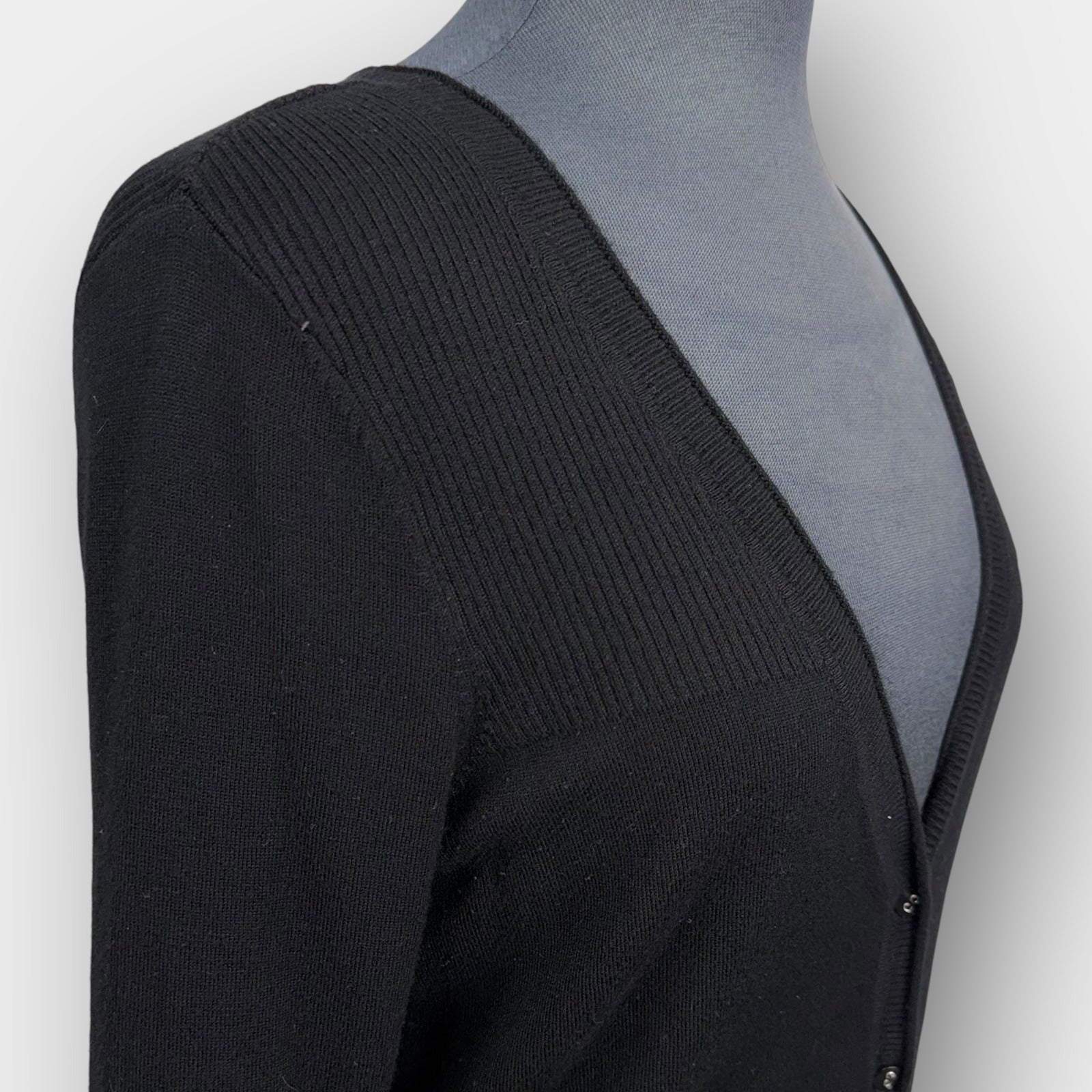 This black button-front cardigan features a deep V-neckline, ribbed shoulder paneling, elbow-length sleeves, and a slim fitted silhouette