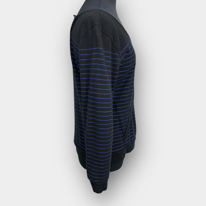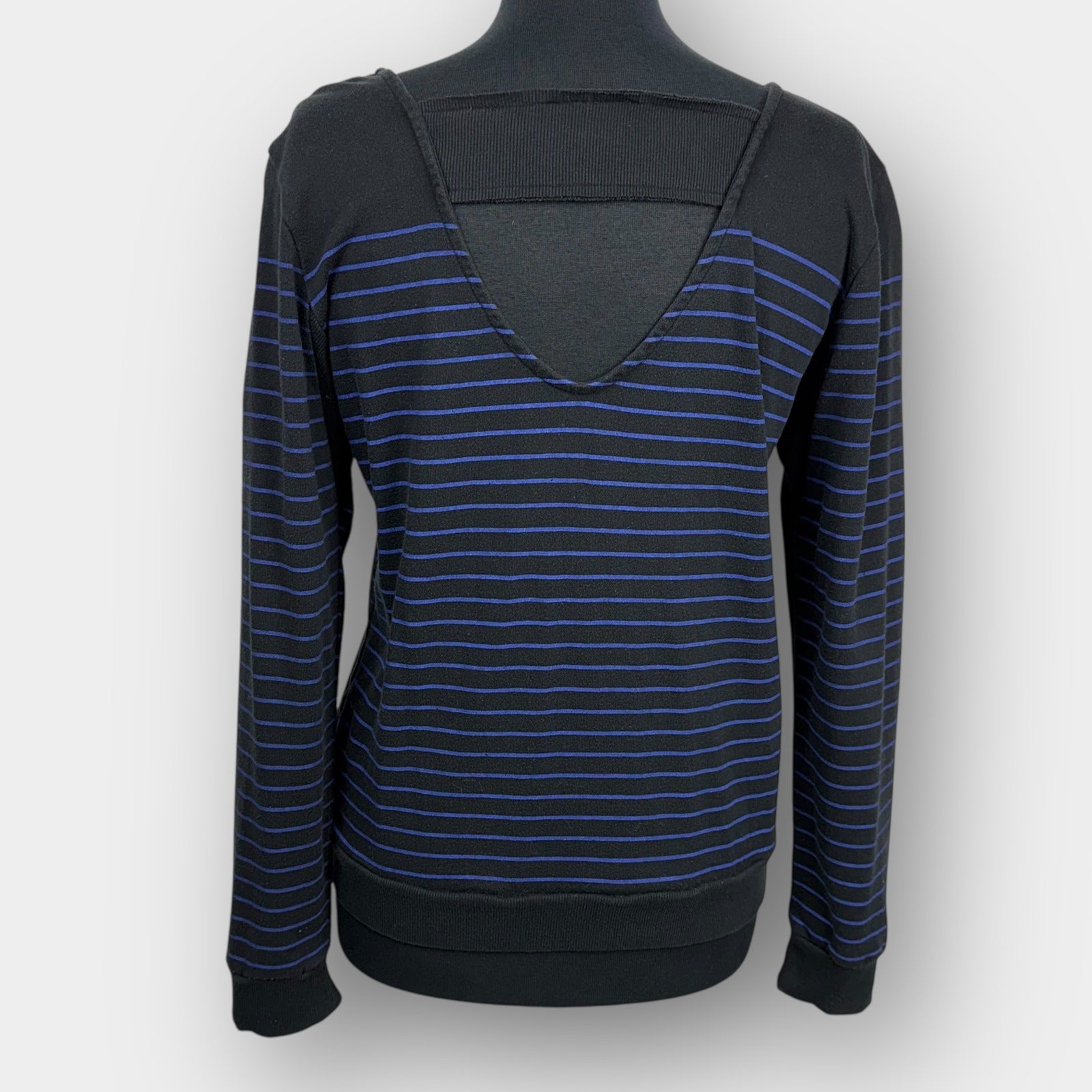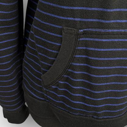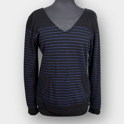 Black pullover with thin blue stripes, featuring a V-neck front and back, long sleeves with ribbed cuffs, front kangaroo pocket, and a slightly cropped length for a modern fit