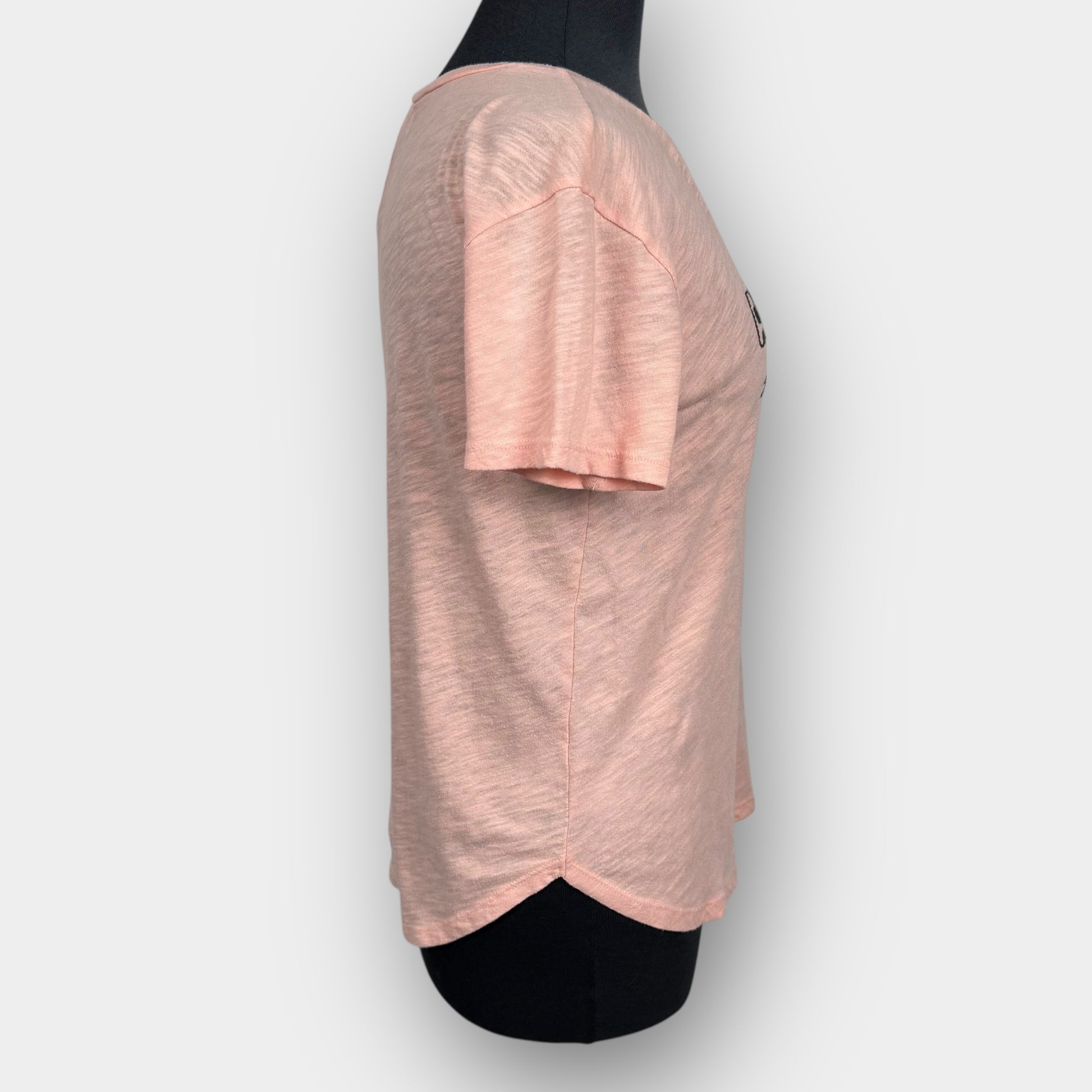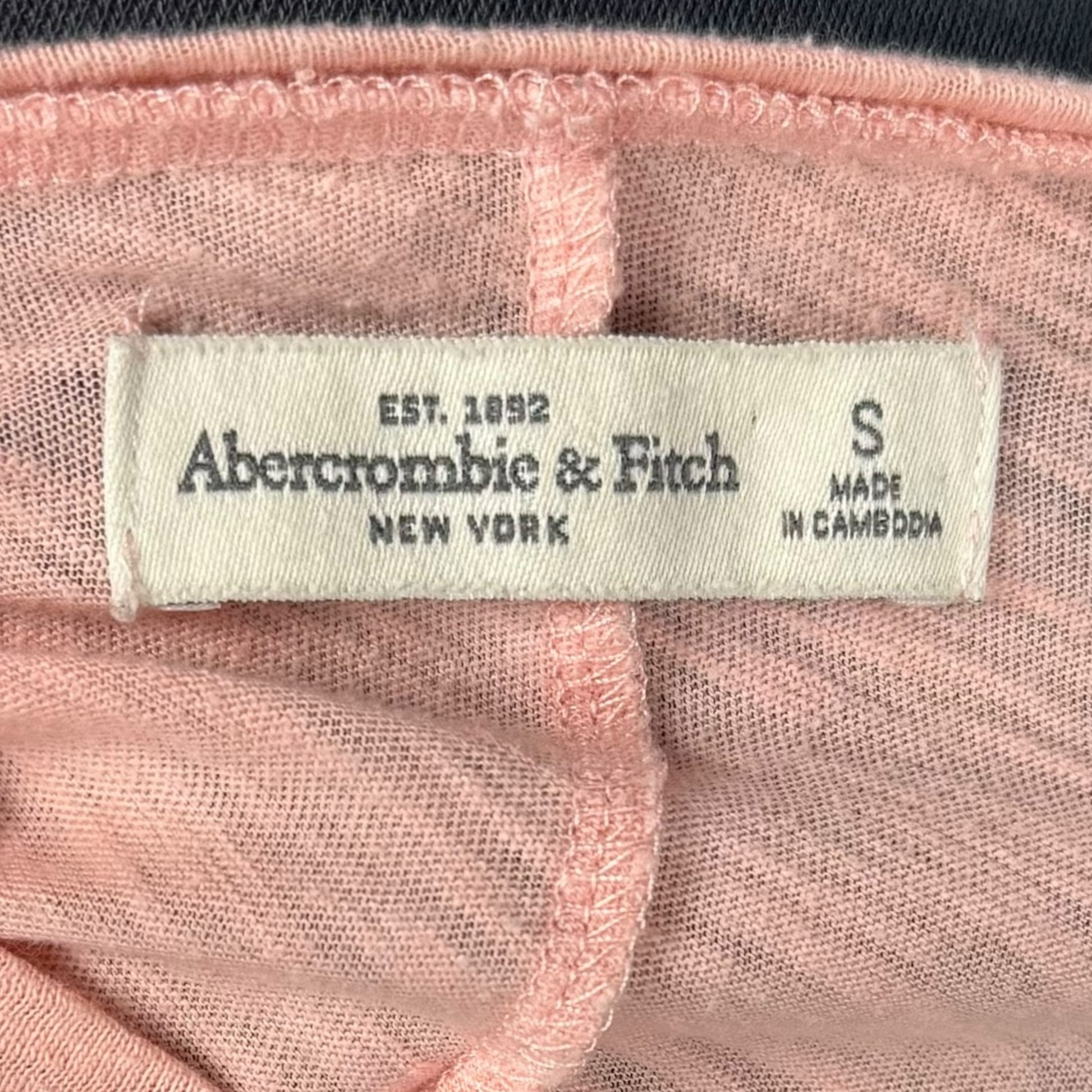Lightweight pink slub-knit tee with a crew neckline, short sleeves, curved hem, and black embroidered “A&Fitch New York” logo across the chest. Thinner fabric by design