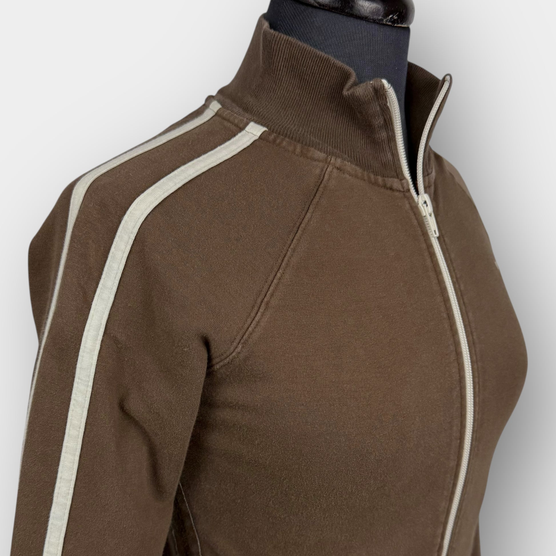 Brown American Eagle Outfitters track jacket with white contrast stripes down the sleeves, a stand collar, and full front zip closure. Features two front zip pockets, ribbed cuffs and hem, and raglan long sleeves. Good pre-owned condition with light overall wear and a small stain as shown