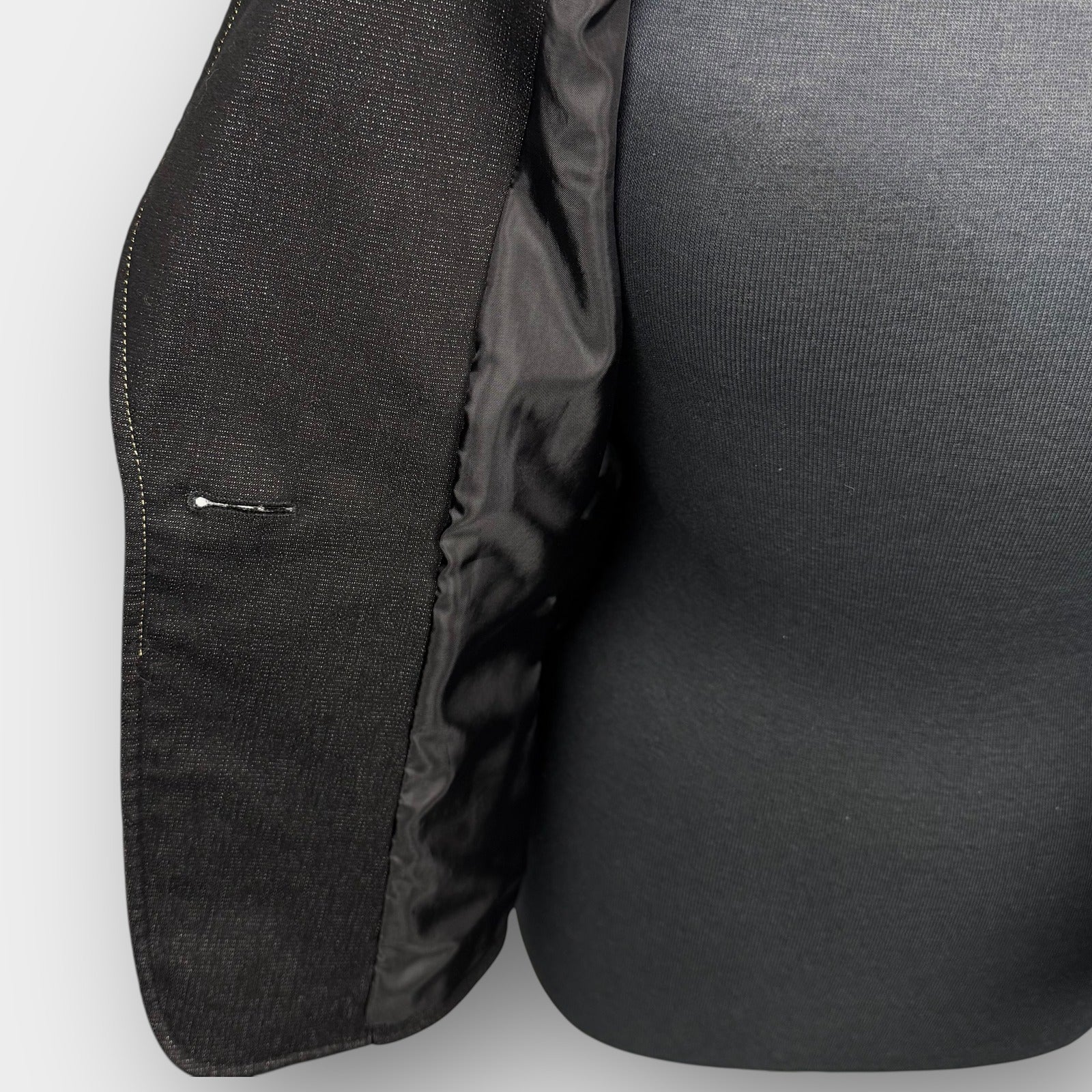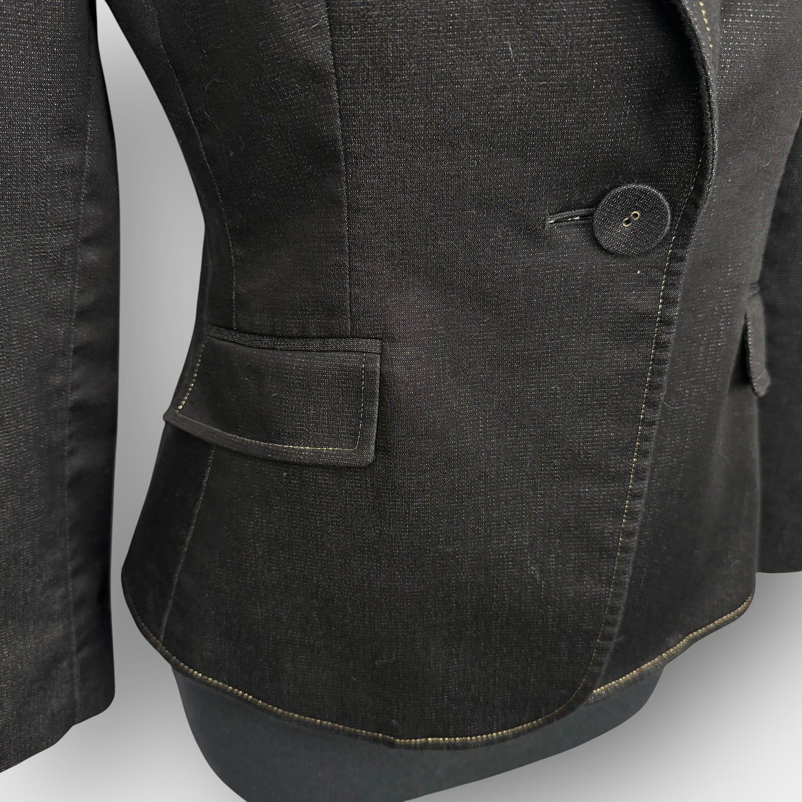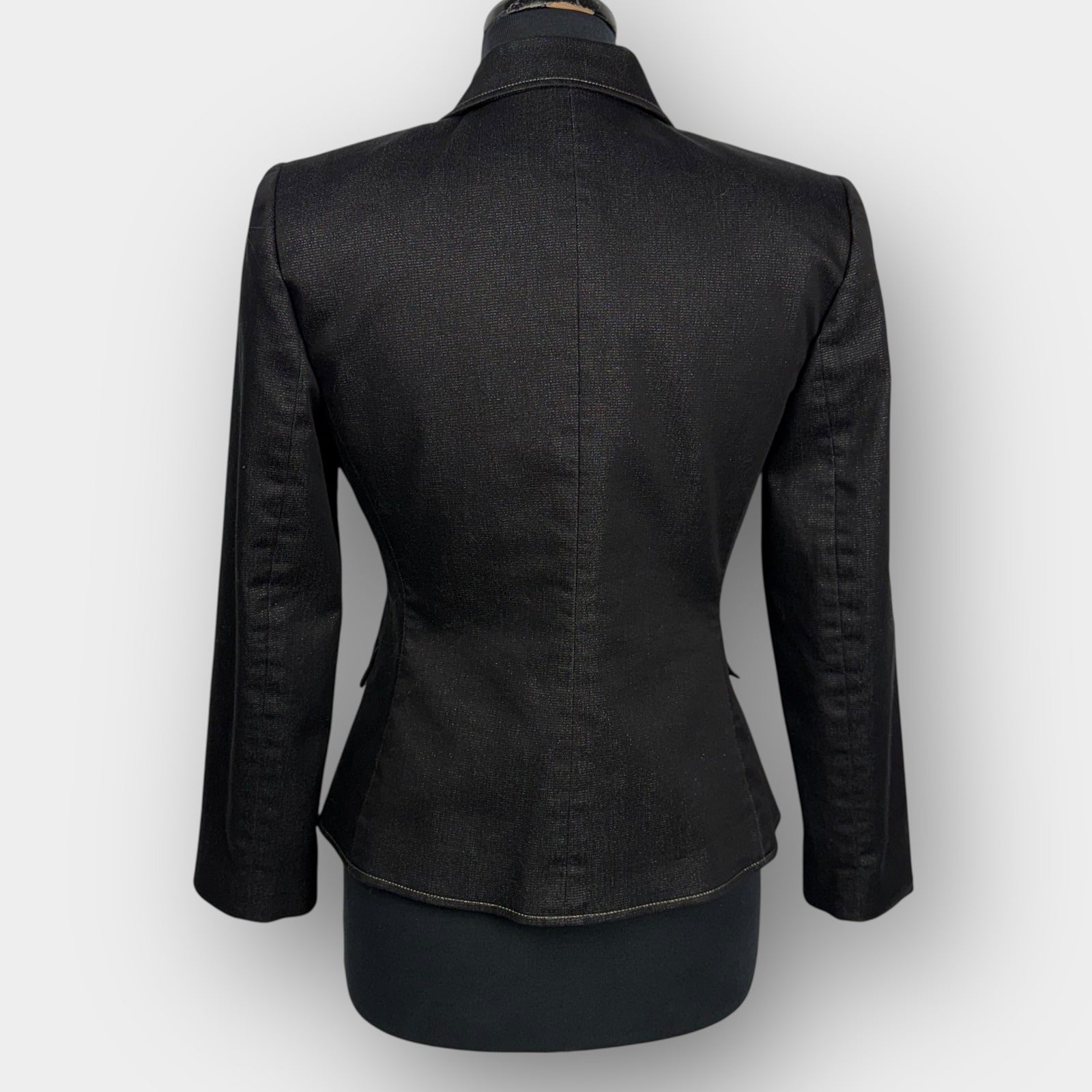 Black lined blazer by Tahari (Arthur S. Levine) in petite 4P, featuring a notched lapel, long structured sleeves, front flap pockets, a one-button closure, metallic sparkle threading throughout, and a tailored waist seam for a workwear silhouette