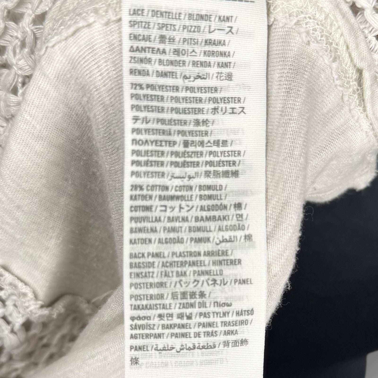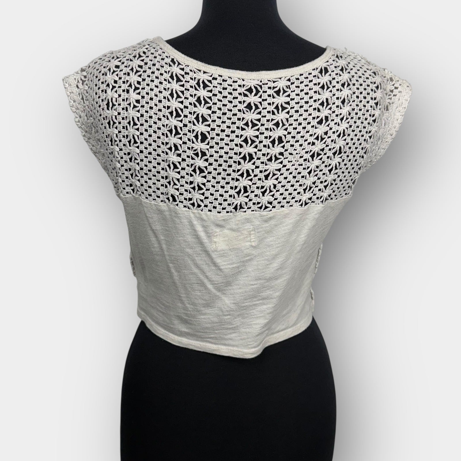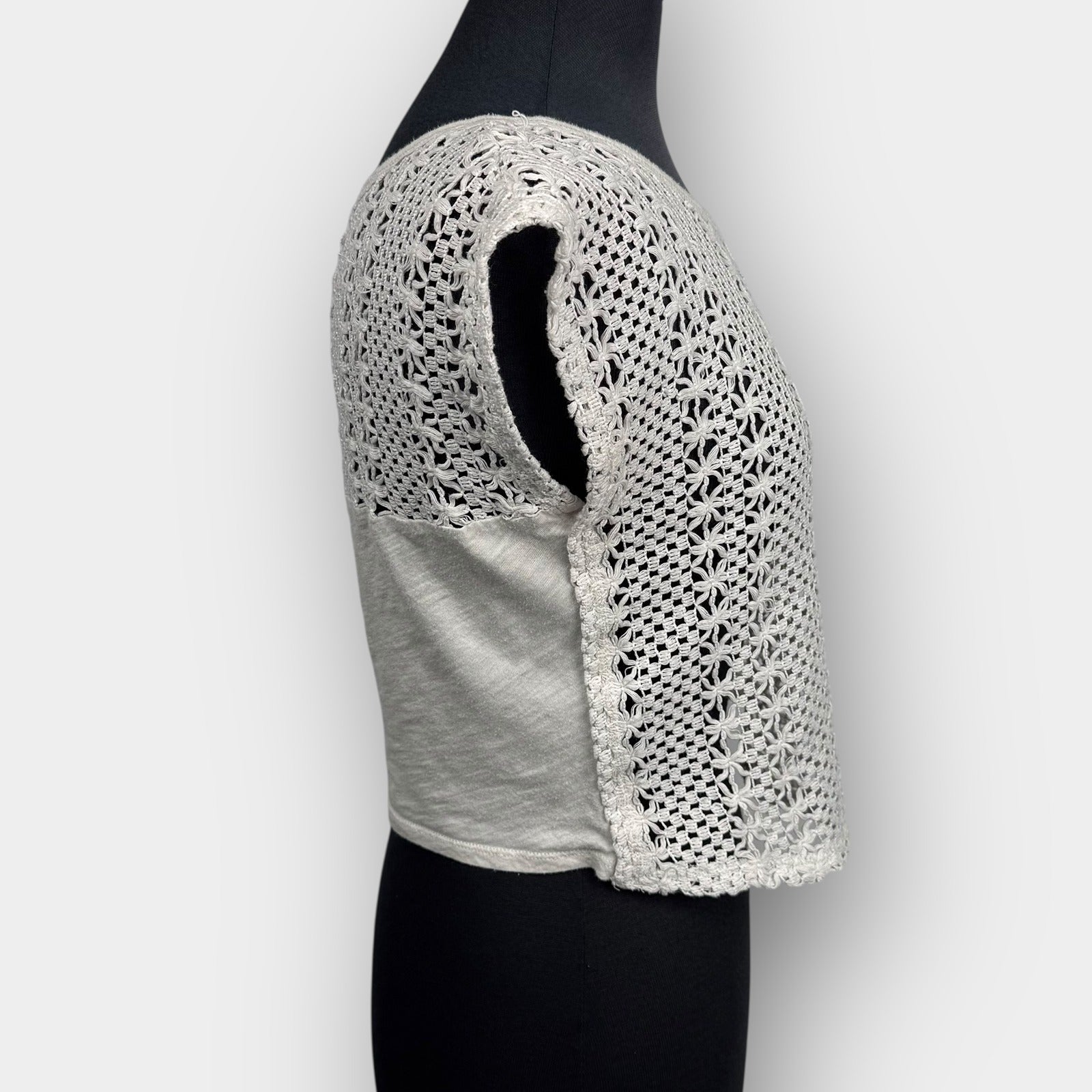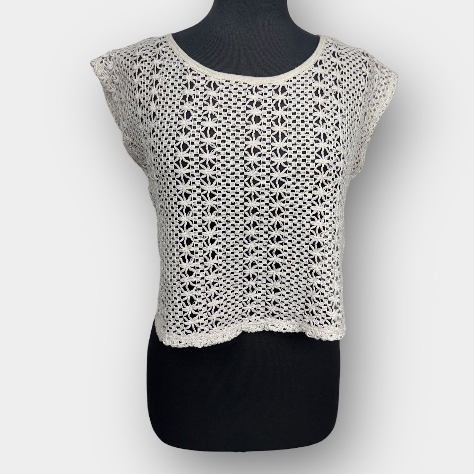Semi-sheer open-work crochet lace with cap sleeves, scoop neckline, scalloped hem, and pullover construction
