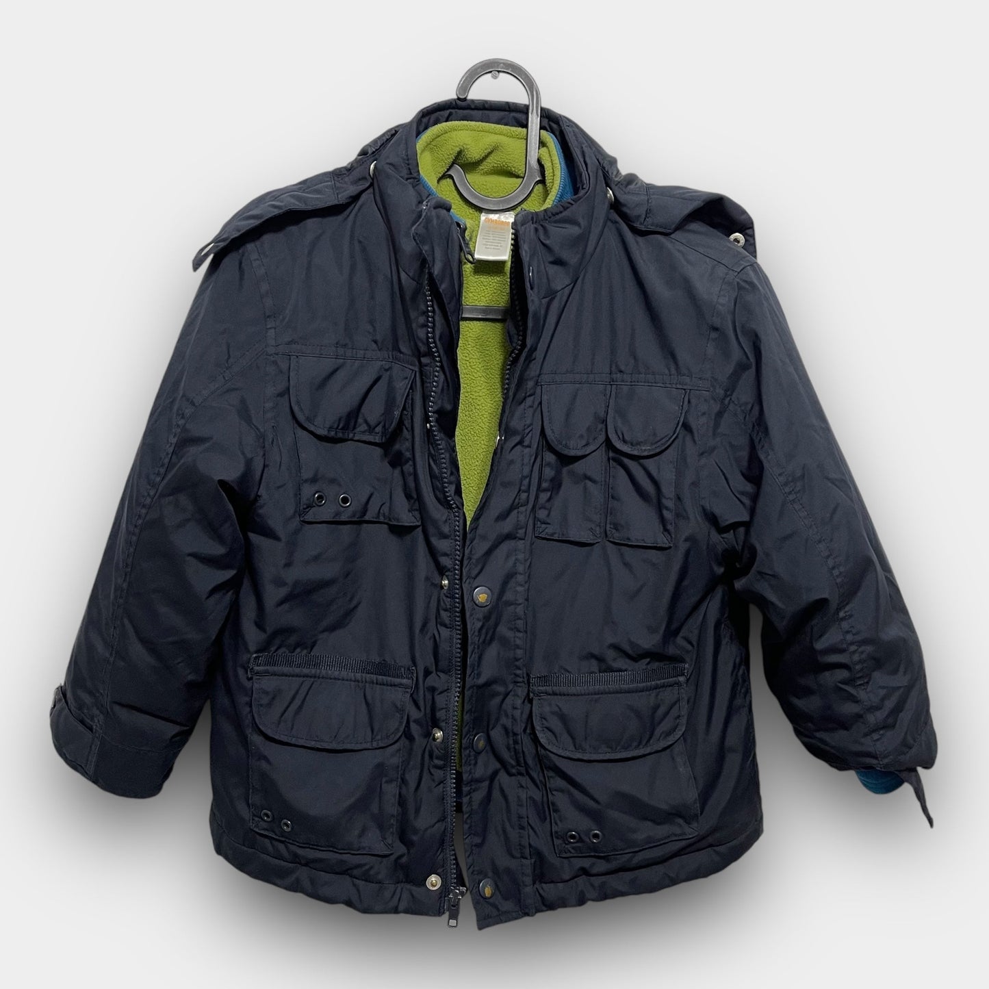 Boys Gymboree jacket in size 5 with a detachable outer liner for versatile wear. Can be worn as a lightweight fleece jacket or combined with the shell for full winter protection. The coat features a zip front with snap placket, four front pockets, and an attached hood trimmed with faux fur and lined in fleece. Adjustable cuffs and durable construction keep kids warm and comfortable outdoors