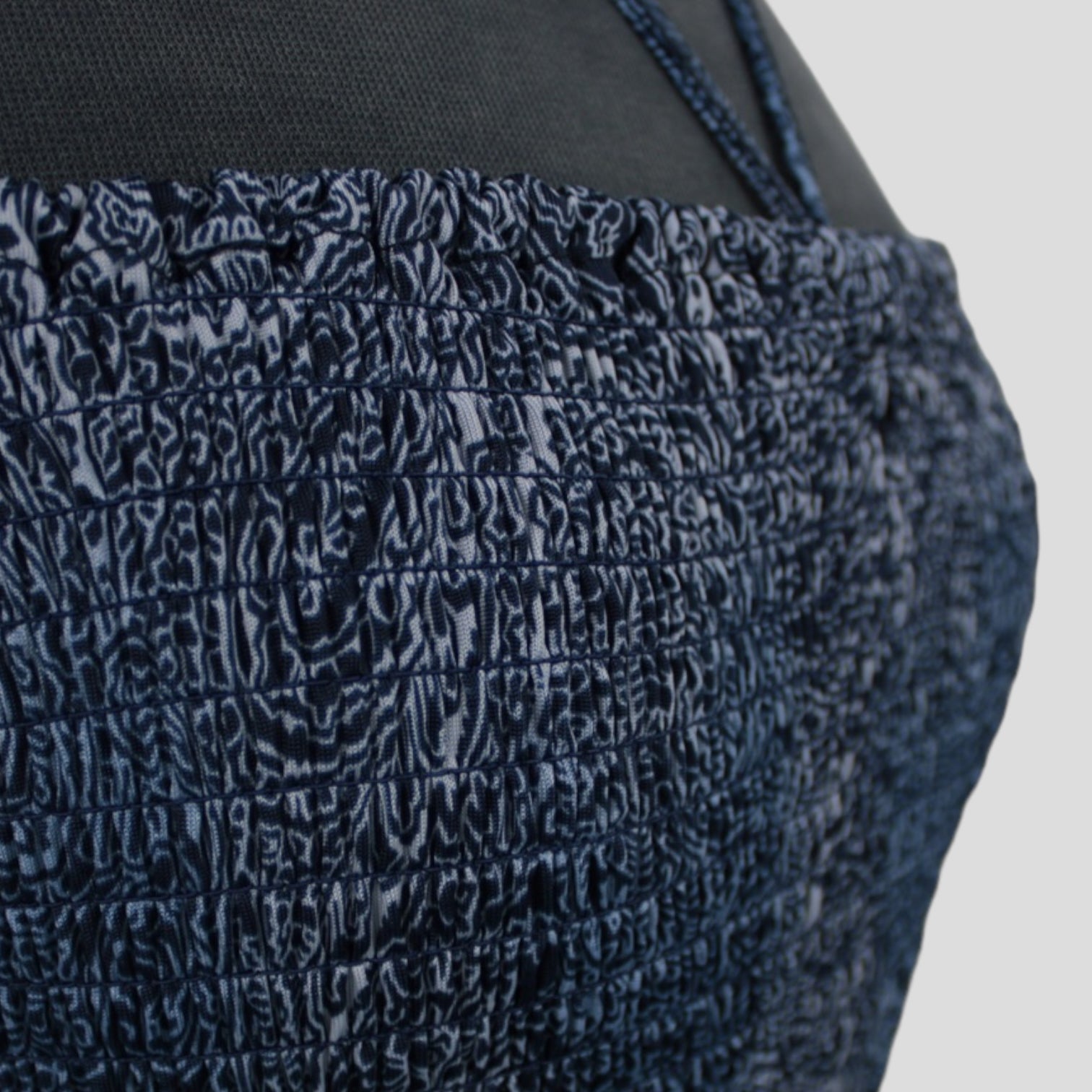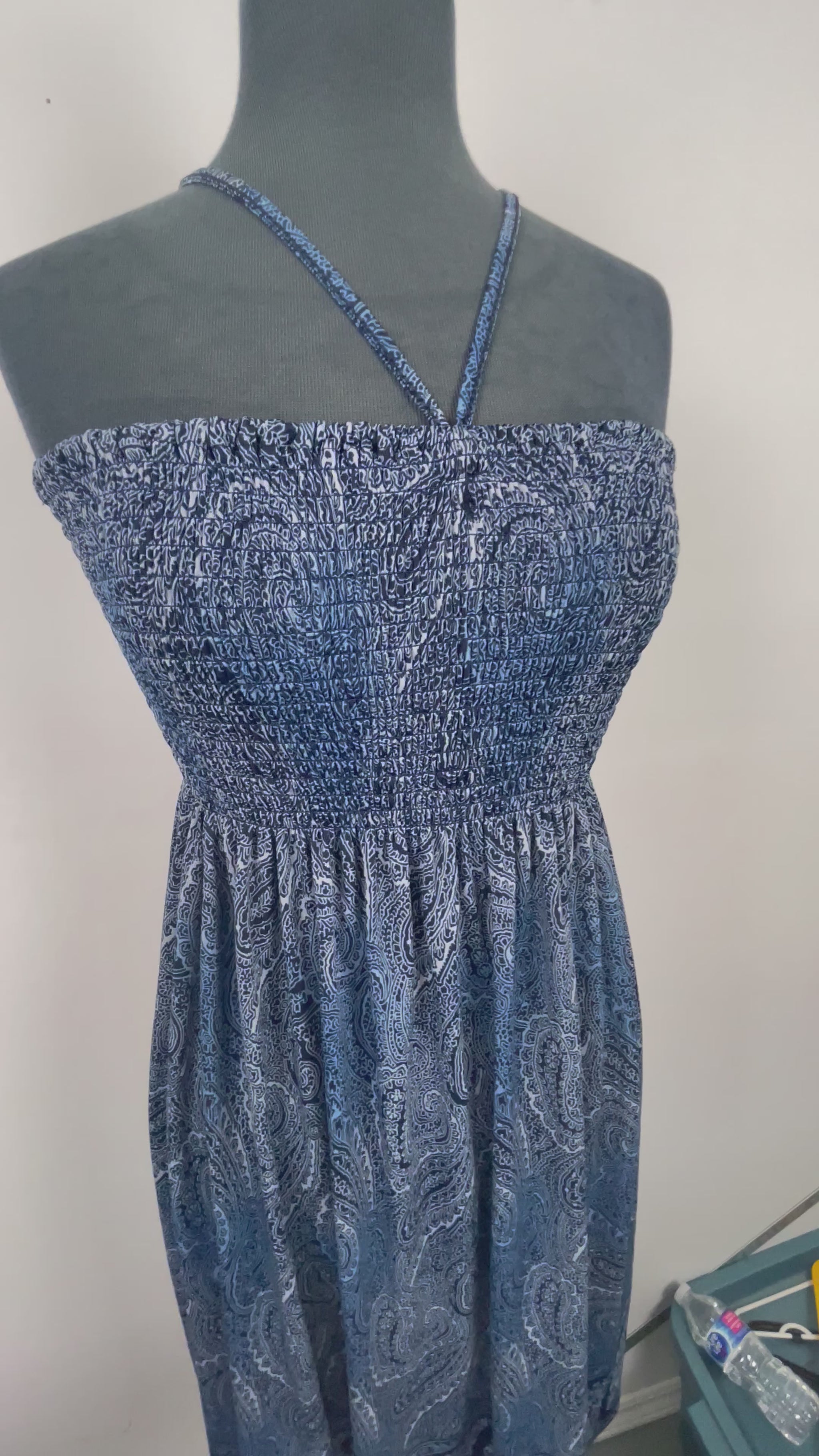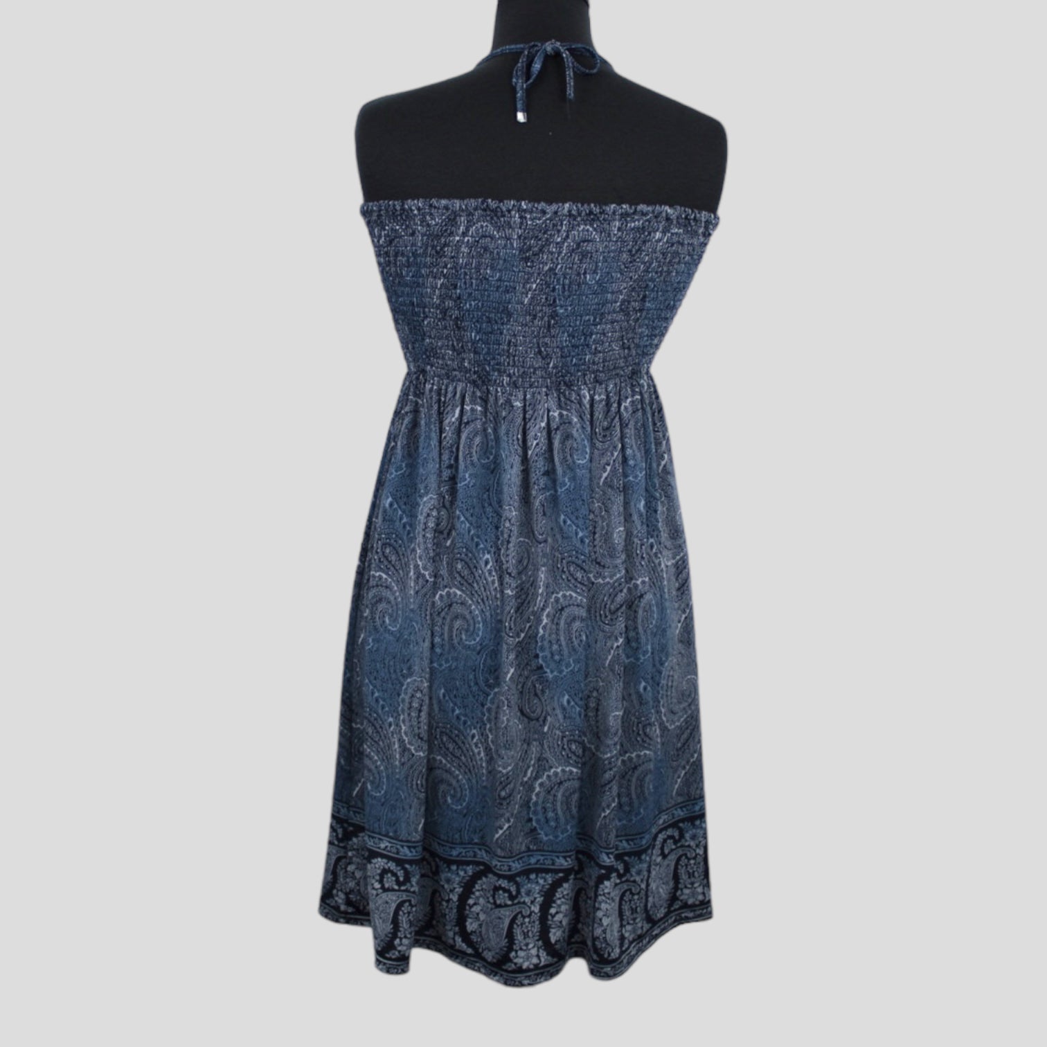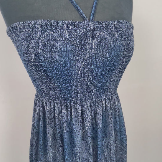 Smocked sundress with an allover blue paisley print, halter tie straps, and a flowy skirt with a contrasting border hem. The smocked bodice offers stretch for a flexible fit, best suited to a size Small